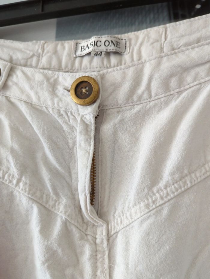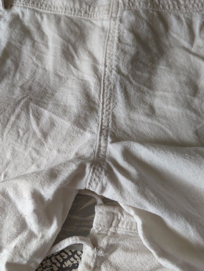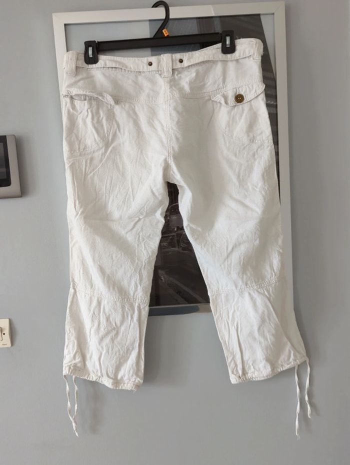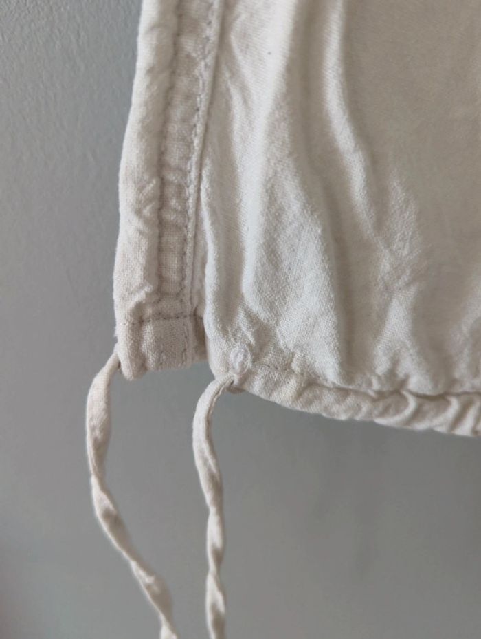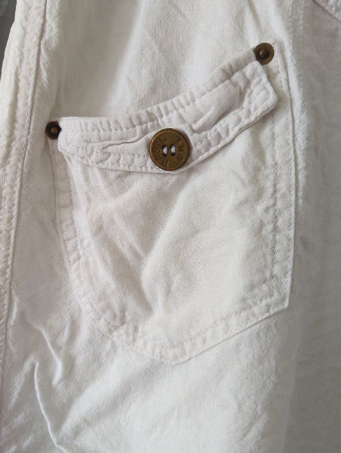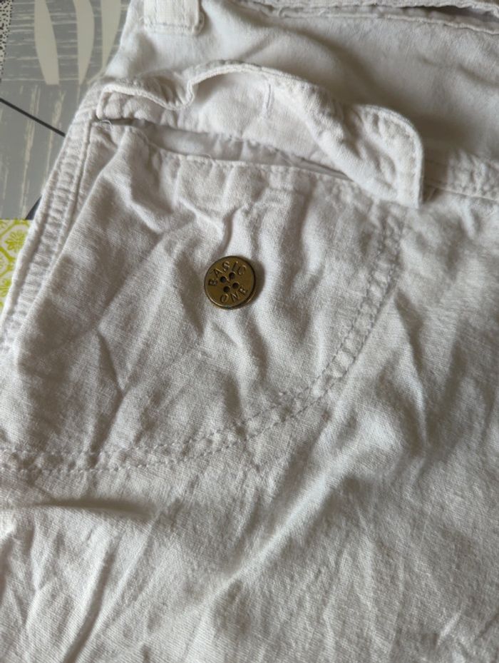 50 % lin 45 % viscose idéal pour l'été à la plage Fermeture auto agrippante 2 poches sympas en biais devant et deux poches arrière, le bouton manquant est fourni lanière à chaque jambe pour reserrage