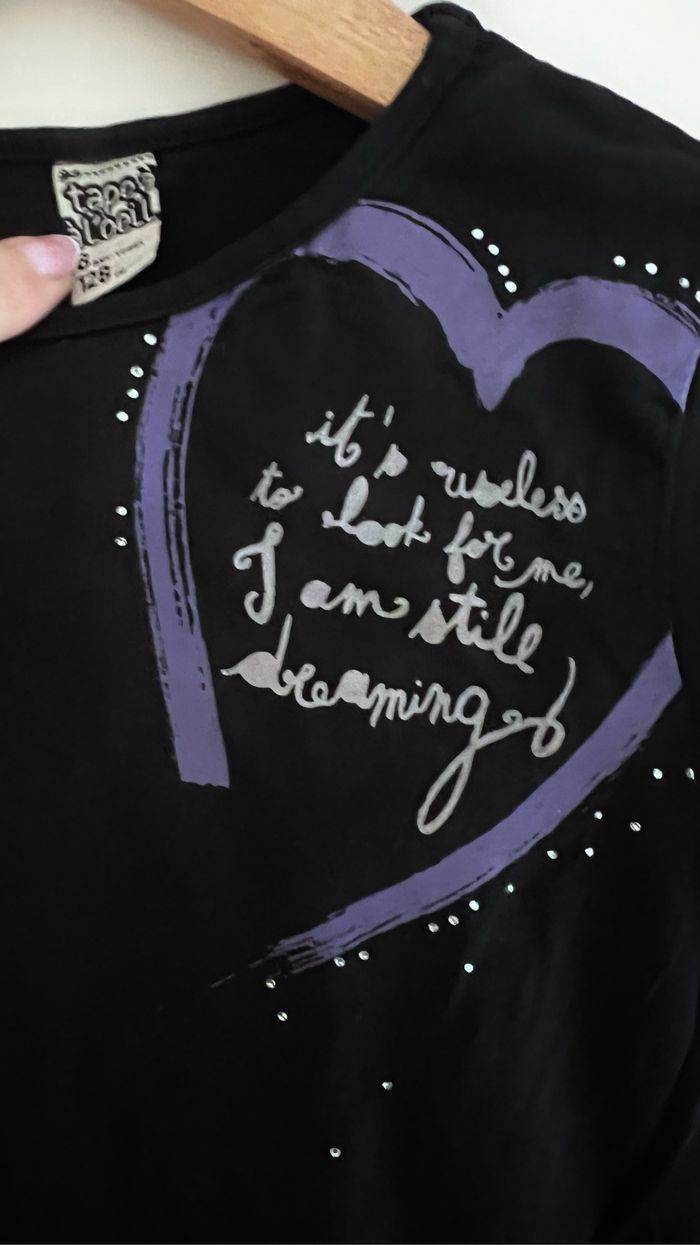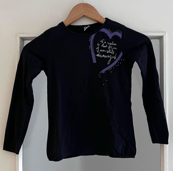 T-shirt à manches longues Tape à l'œil Taille 8 ans (mais taille plutôt du 6 ans) Coloris noir, violet Imprimés blancs Petits strass blancs 100 % coton Maison non fumeur et sans animaux 📩Je réponds rapidement aux messages 📦Envoi rapide et soigné