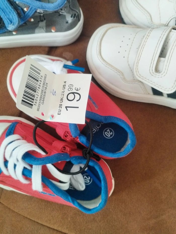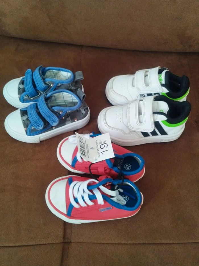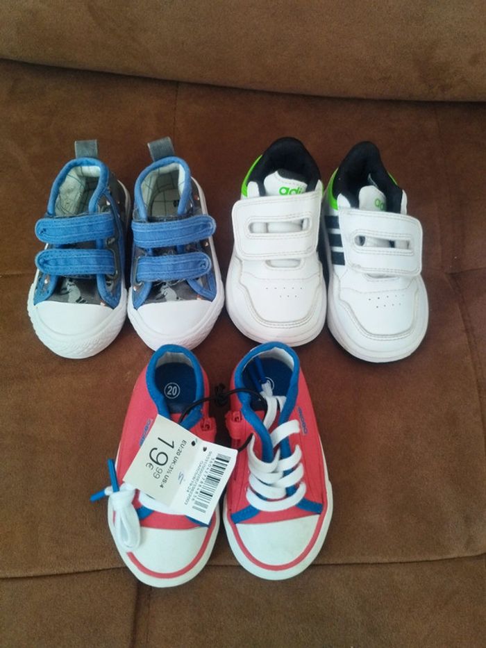 1 paire blanche Adidas en très bon état 1 paire rouge et bleue Obaibi neuve avec étiquette 1 paire à scratch à motifs en bon état Pointure 20 #mabiquette10chaussures