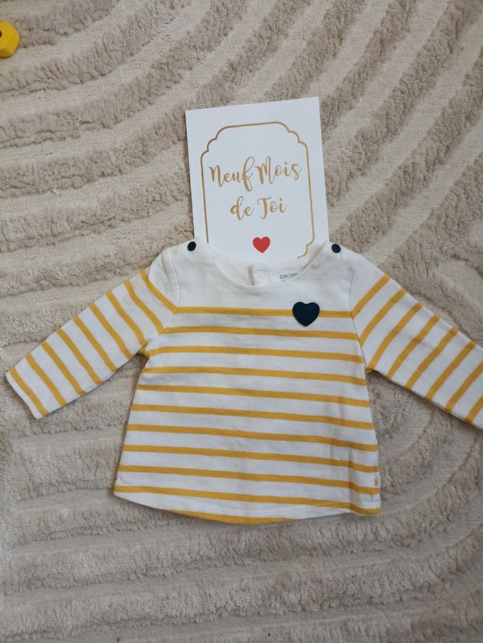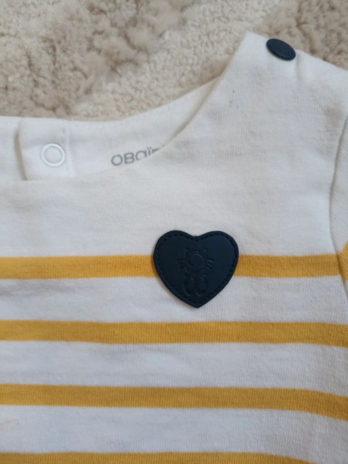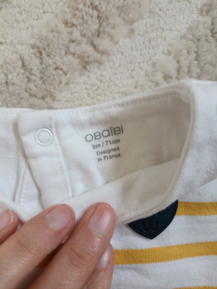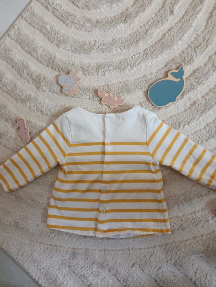 Marinière jaune et blanche Taille 9 mois Marque Obaibi Très bon état Matière coton Boutonnière dans le dos