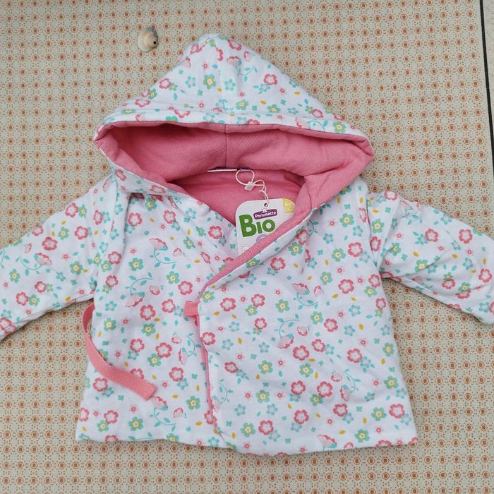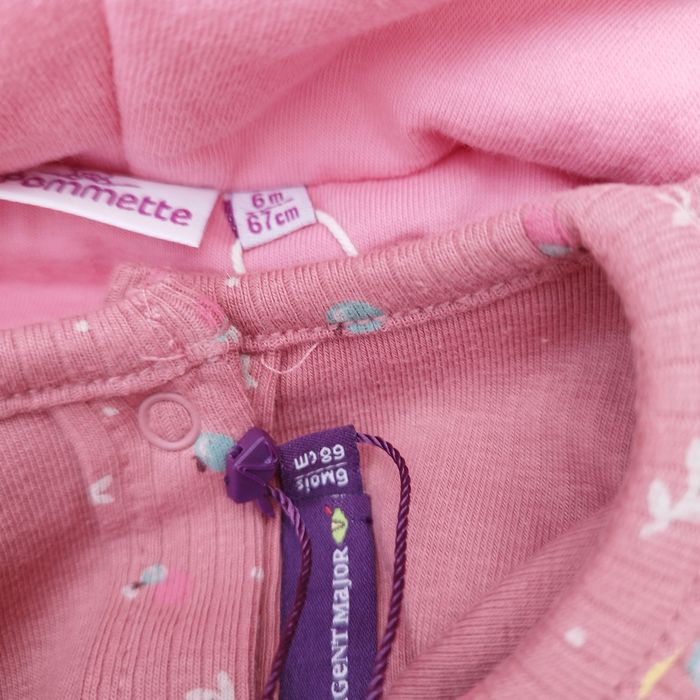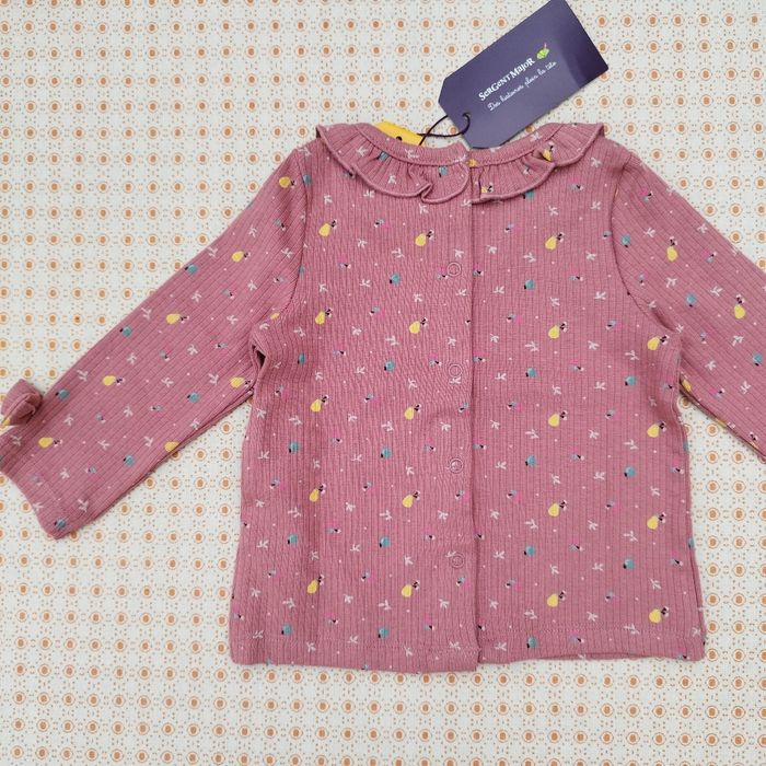 Veste à capuche tout doux, avec un motif floral. Elle se ferme avec un nœud et un rivet à l'intérieur. Marque Pommette avec étiquette. Blouse Sergent major manches longues imprimé fruits. Col a volants. Maille côtelé. Noeuds sur le bas des manches.