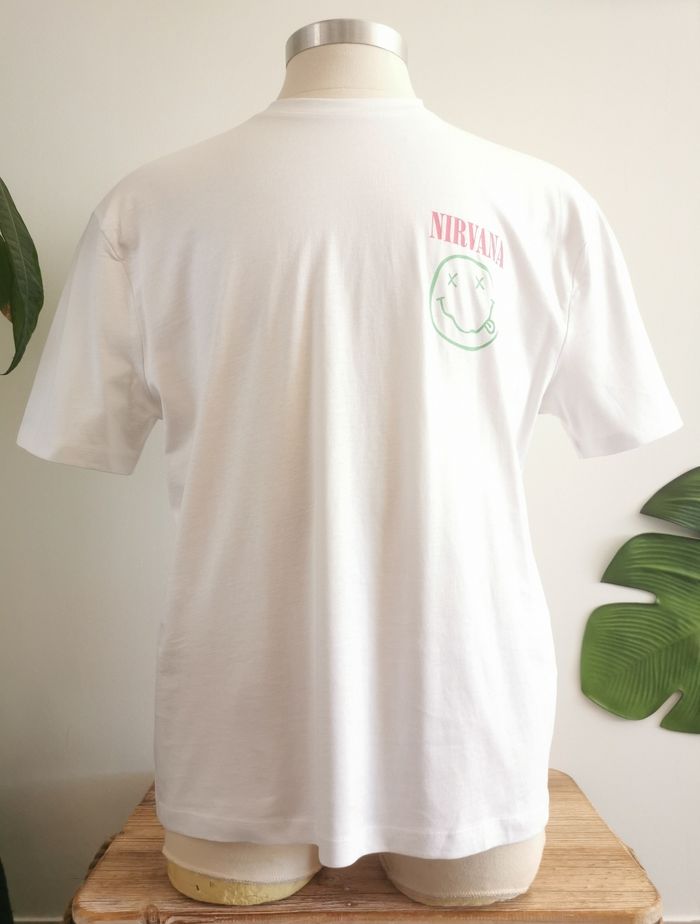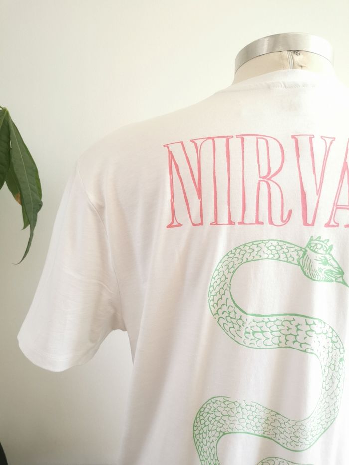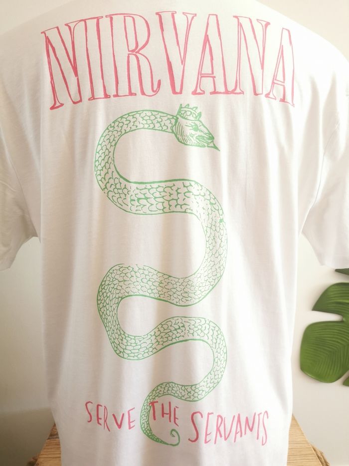 👕 ÉTAT DE L'ARTICLE: 10/10 ✅️ Sans étiquette, jamais porté 📷 Photos portées du site disponibles en message privé 📷 Tee-shirt 👕 Nirvana Unisexe 🙎‍♀️🧔 Asos Design Taille S • Matière: 100% coton • Coupe oversize • Col rond • Manches courtes • Nirvana 😋 sur la poitrine • Serpent 🐍 Serve The Servants imprimé dans le dos • Couleur: Blanc ⚪️ • 📏 Longueur: 74 cm • 📏 Mesure épaules: 55 cm • 📏 Mesure sous aisselles: 65 cm Parfait état👌, jamais porté 📎