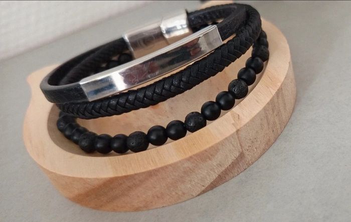 Bracelet en pierre volcanique, acier inoxydable et cuir - photo numéro 1
