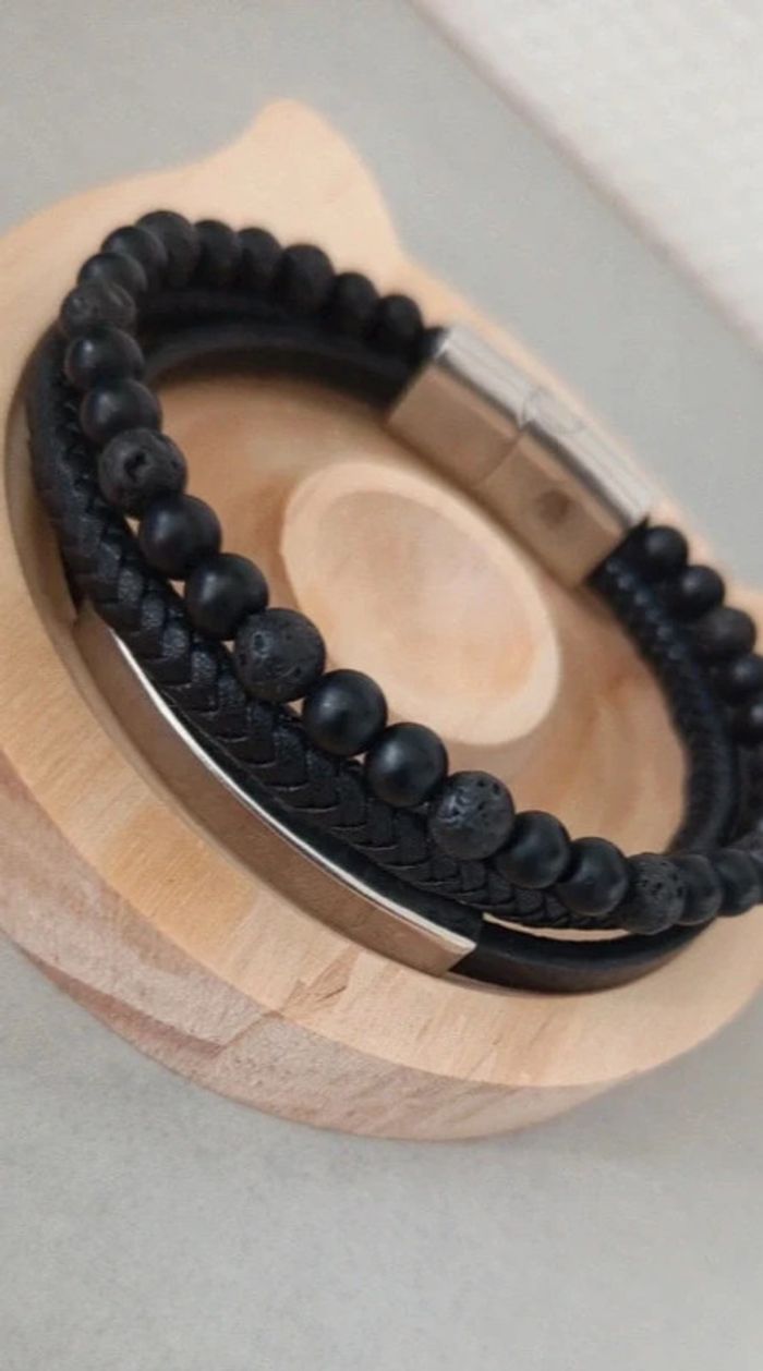 Bracelet en pierre volcanique, acier inoxydable et cuir - photo numéro 8