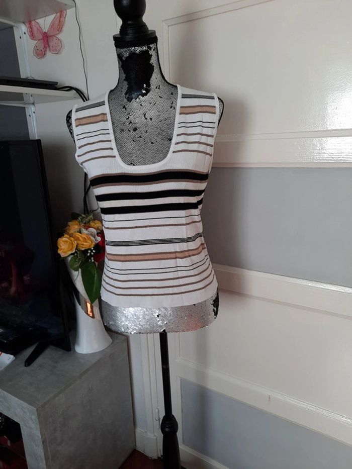 Débardeur femme taille 44 mais taille petit donc 42 très bonne état N hésitez pas à faire un tour dans mon dressing et achetez en lot vous ferez des économies sur les fdp 😉 😉 #moutsimoumounehabitfemmetaille44