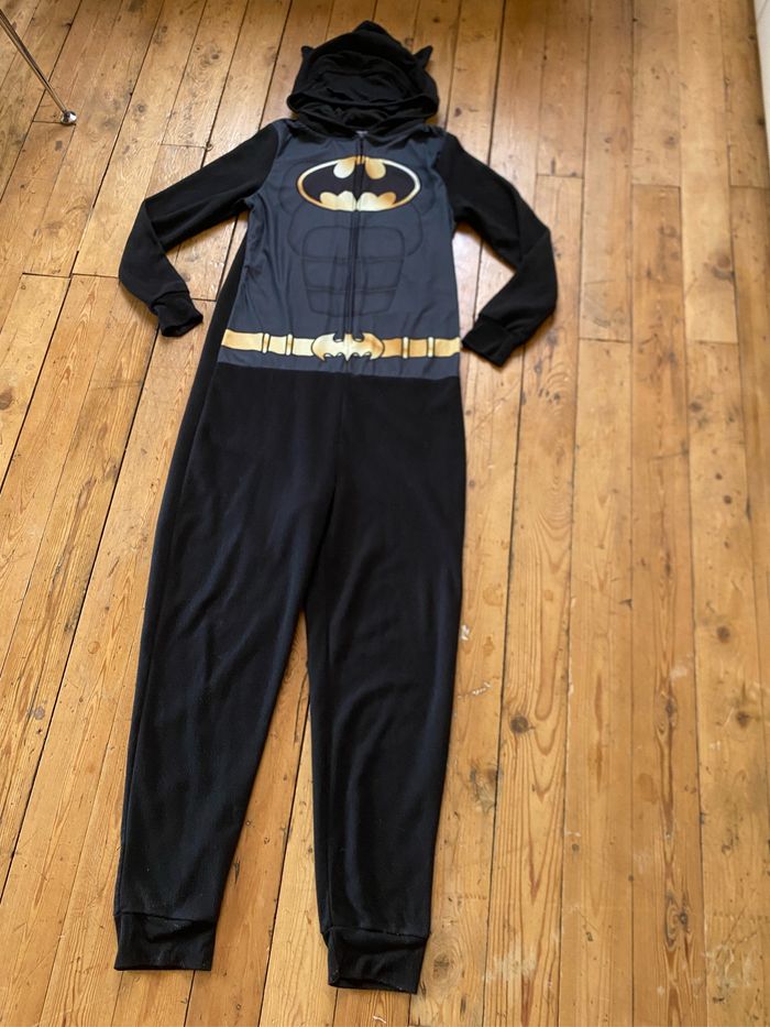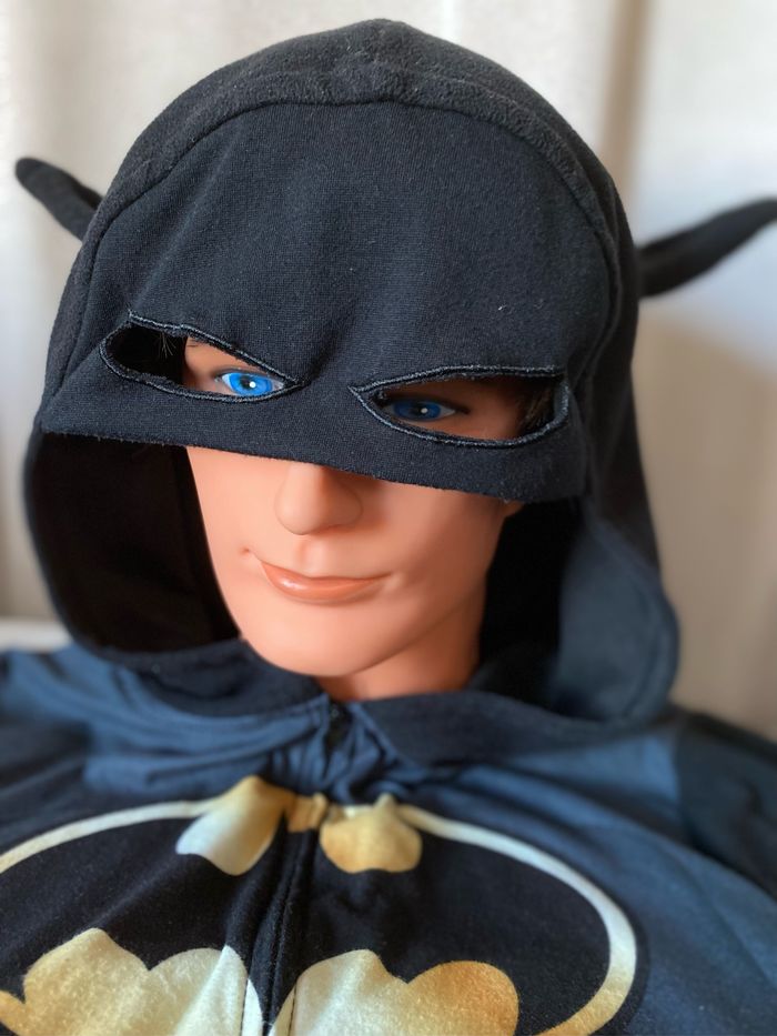 Déguisement polaire combinaison capuche masque Batman M adulte Mesures De l'épaule à l'entrejambe 94 cm Longueur entrejambe 71,5 cm Carrure 36,5 cm Aisselle à aisselle 48,5 cm Longueur dessous de manche 48,5 cm Longueur totale sans la capuche en partant de l'épaule 154 cm