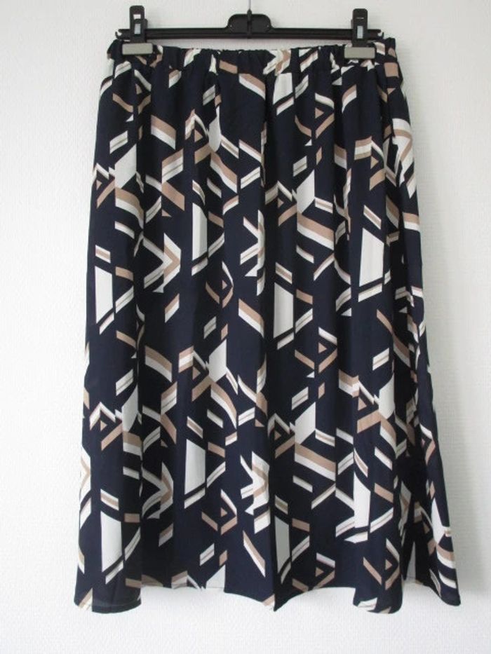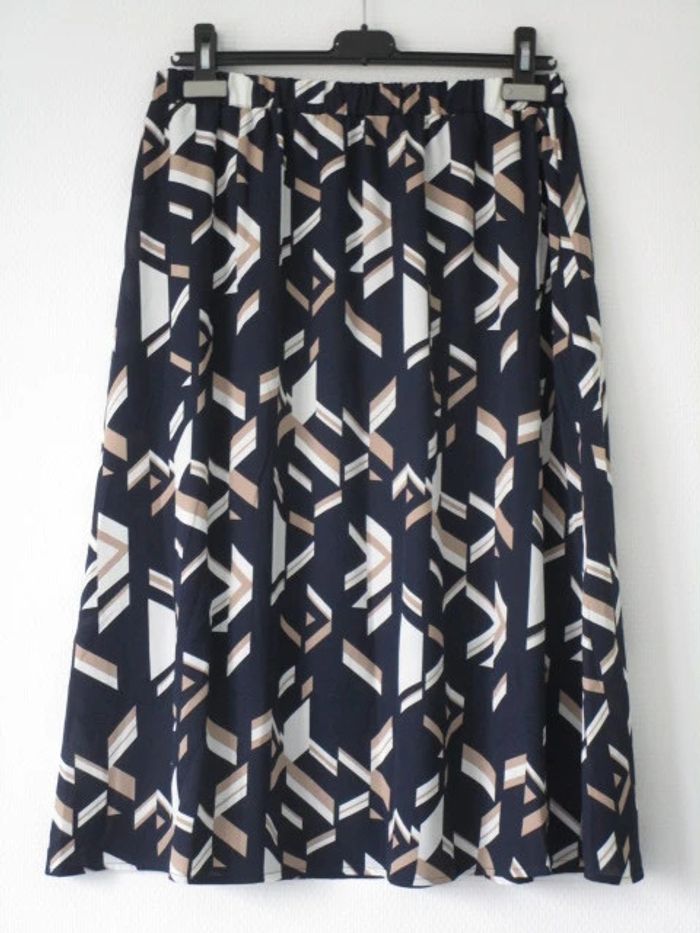 Jupe bleu marine de marque Afibel taille 44 Motifs crème et beige Forme fluide Doublée Totalement élastiquée à la taille 100% polyester Largeur ceinture : 39 cm Longueur : 75 cm NEUVE, jamais portée #mamanbrade59femme42 #mamanbrade59femme44
