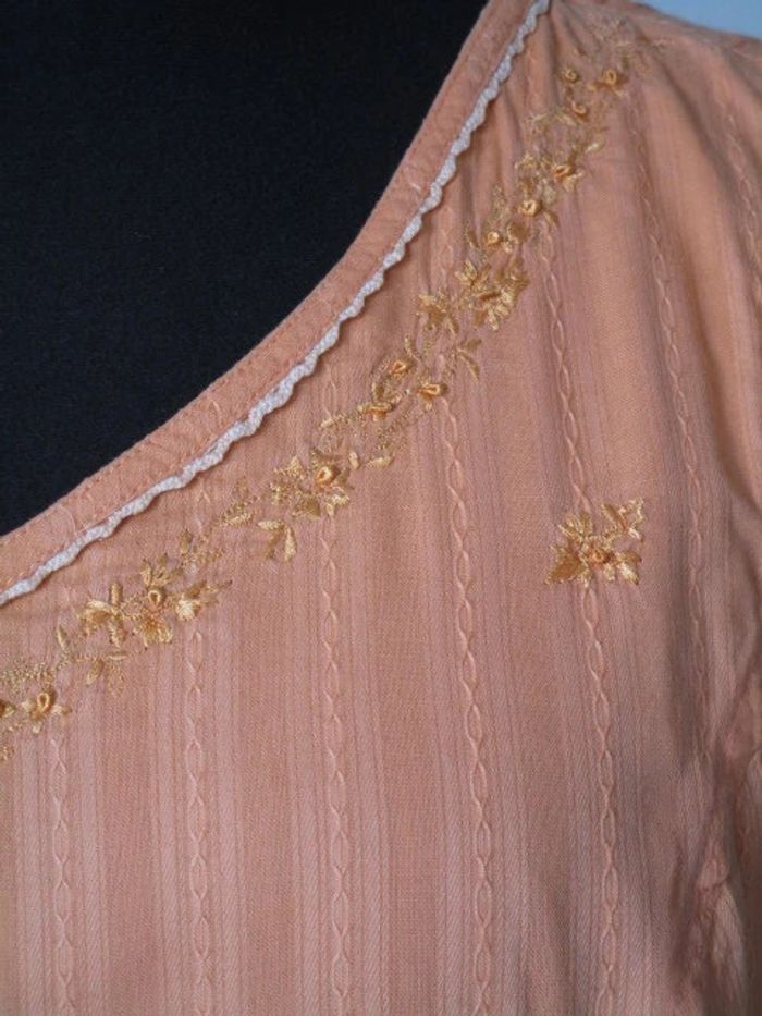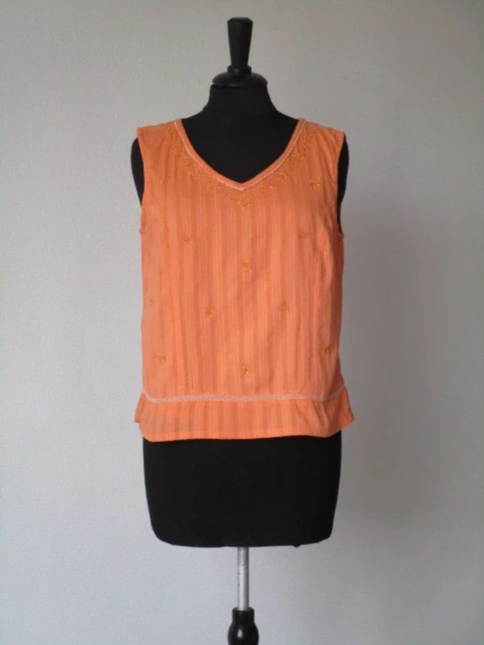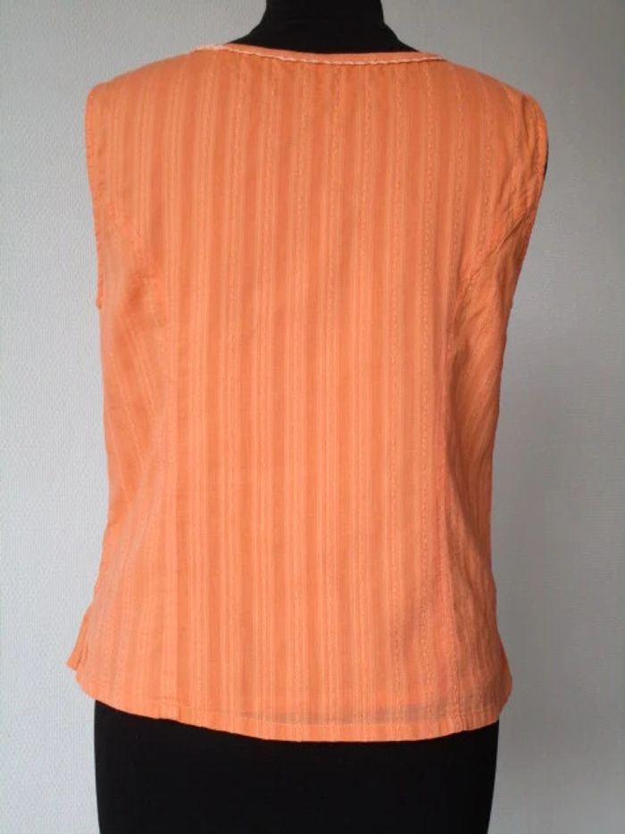 Blouse orange vintage Sans manches Assez courte Pas d'étiquette de marque, ni de taille (correspond à du 38 cf mesures) Tissus finement travaillé Petites broderies ton sur ton Fin liseré de dentelle autour du col V ainsi que dans le bas Doublée Fermeture sur le côté 100% coton Largeur carrure : 37.5 cm Largeur aisselle à aisselle : 48 cm Longueur : 54 cm En très bon état #mamanbrade59femme38