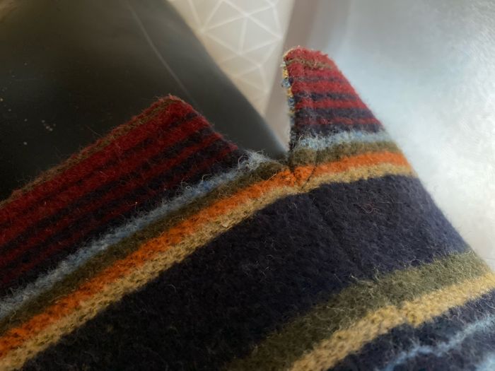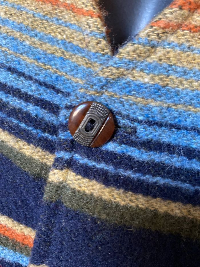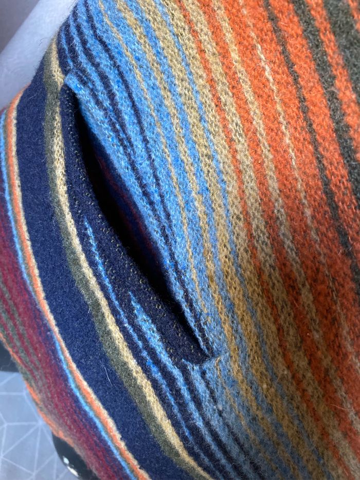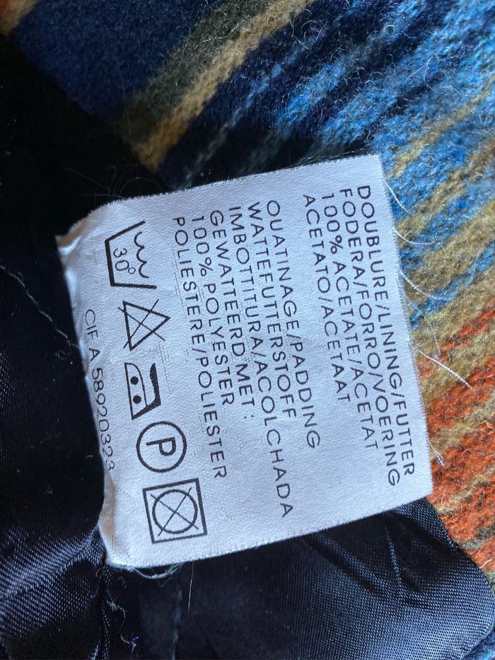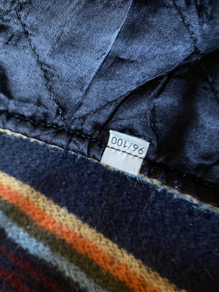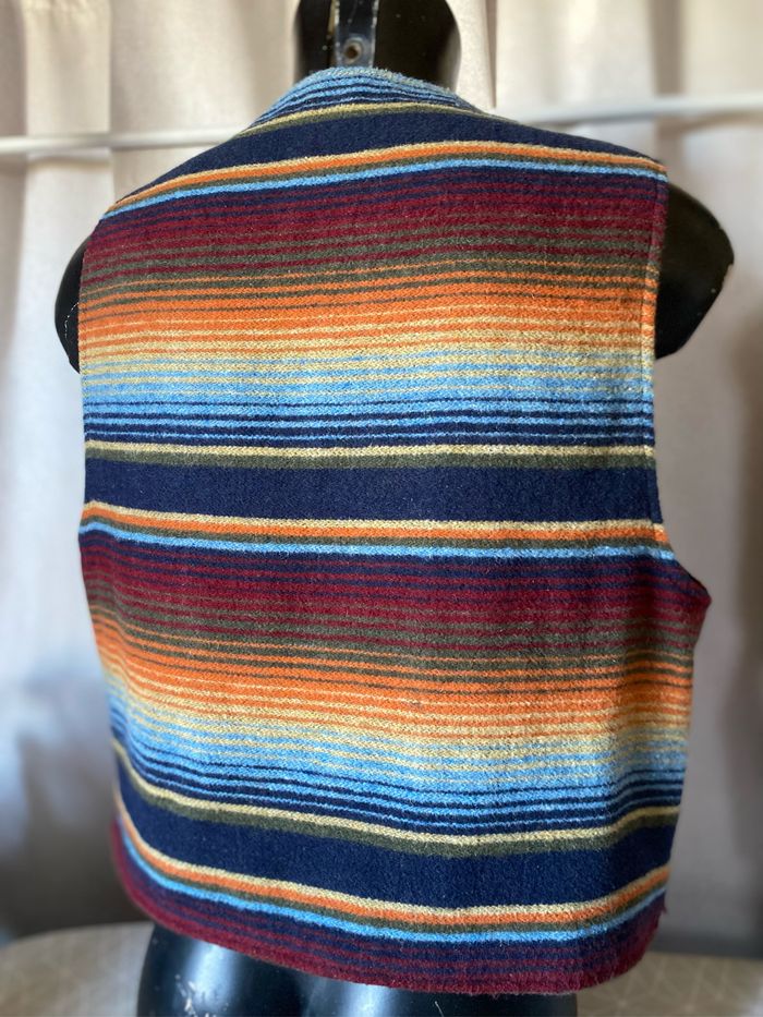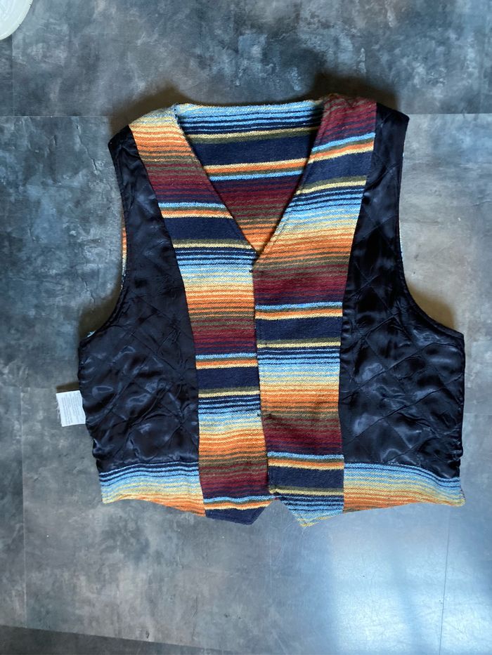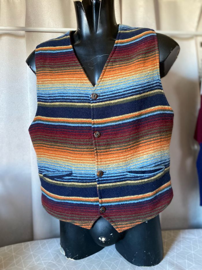 Gilet laine jacket en parfait état , lavé. Taille 96/100 2 poches passepoilées Pointes sur les devants Fente sur chaque côté Vintage Rayures multicolores fin lainage kaki bordeaux orange bleu ciel indigo jaune paille 42% polyester 42% acrylique 14% laine 2% autres fibres Doublure noire matelassée 100% acétate Ouate 100% polyester Dimensions Carrure 39 cm Aisselle à aisselle 56,8 cm Largeur à plat sous les poches 54,3 cm Longueur 60 cm