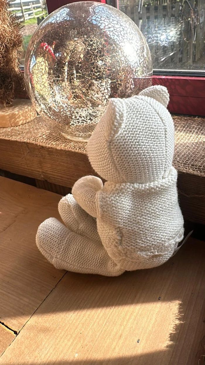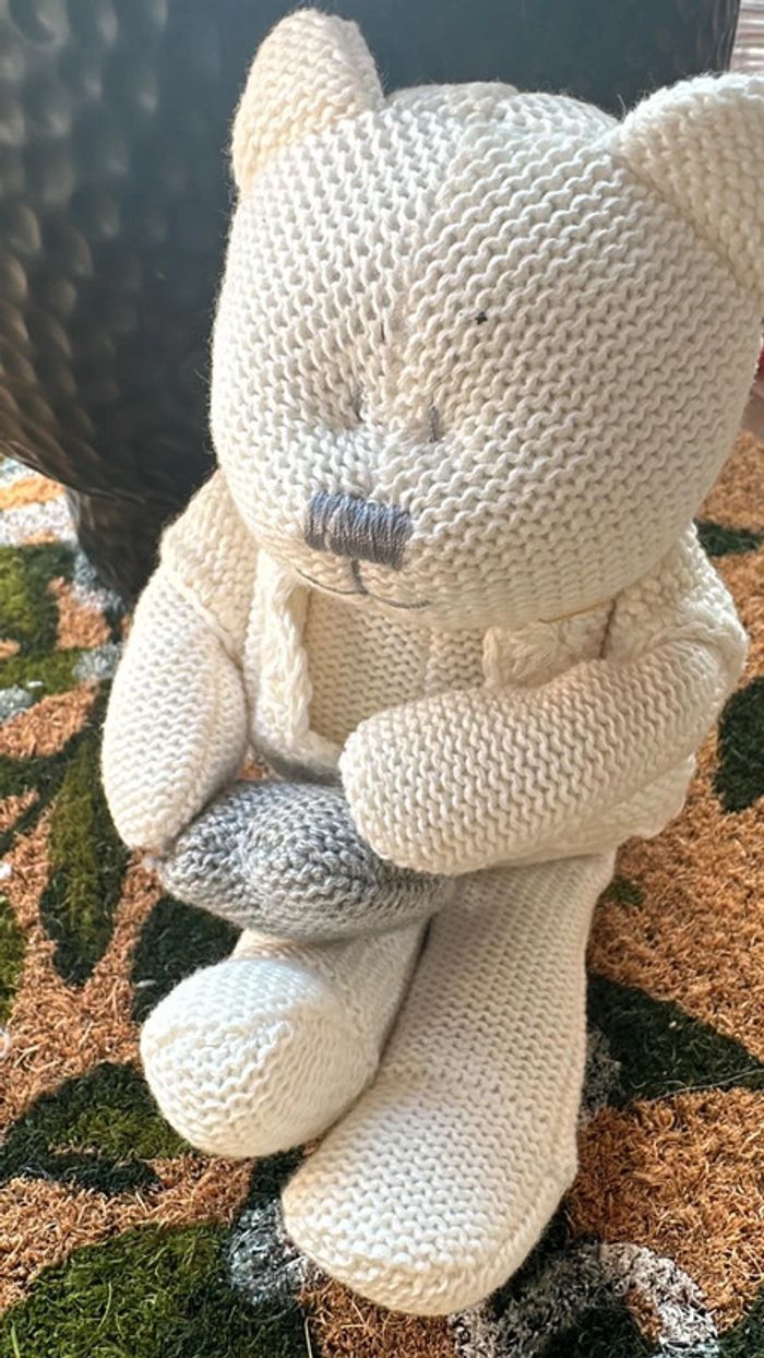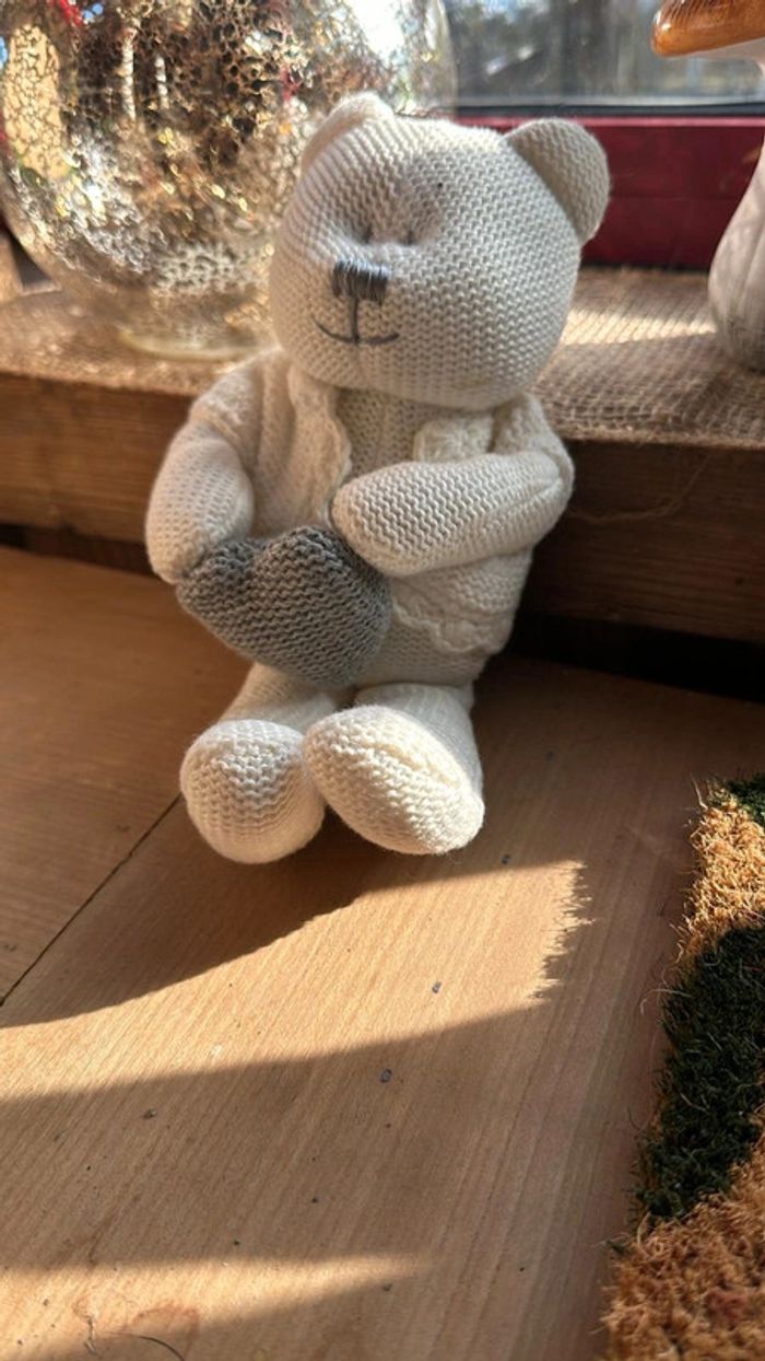 Ourson tricoté crème avec cœur gris Hauteur 23cm