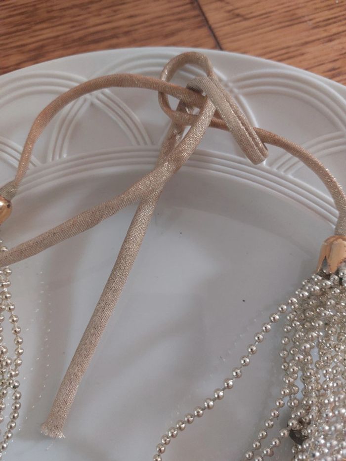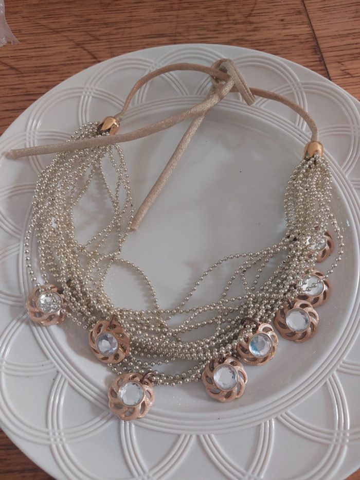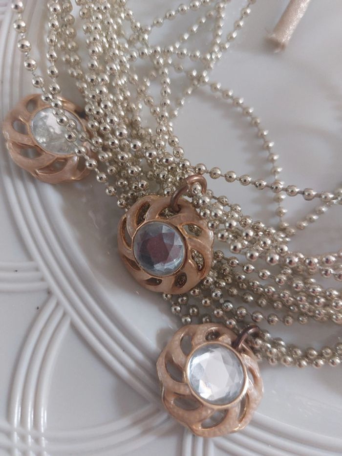 Collier 19 rangs chaîne petites boules avec 8 pendentil a cabochons strass Se ferme par un lien à nouer doré avec lurex. Acheté en 1999 dans une boutique de robe de marié Longeur 85cm Hauteur pendentif 2,2cm