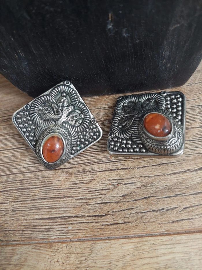 Paire de boucles d'oreilles argenté avec cabochon ambré Achetées dans les année 80 Hauteur 5cm, elles se portent en diagonale (losange) avec la pierre vers le bas