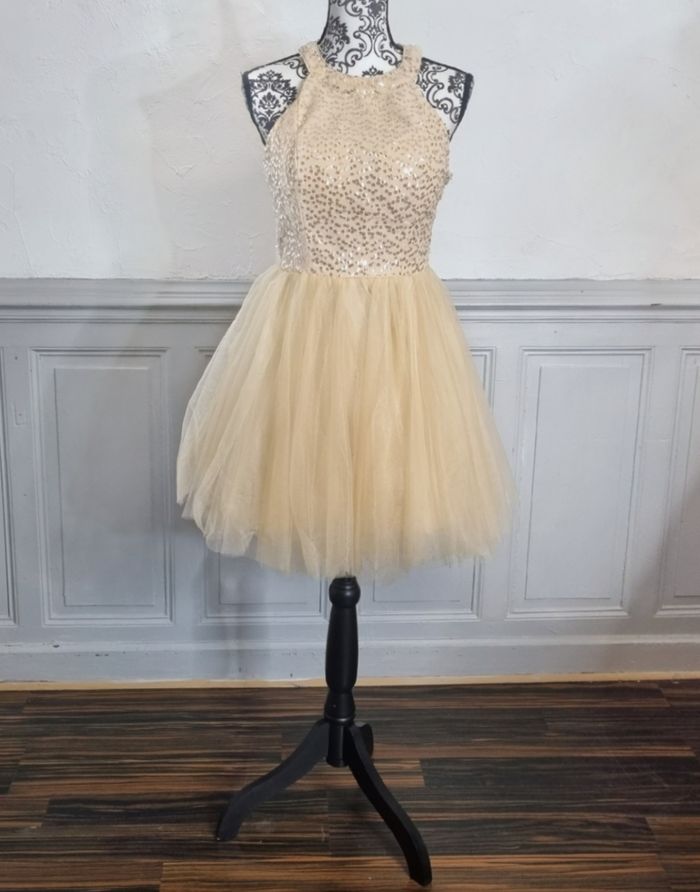 robe de soirée courte beige col américain buste avec sequins taille 42 - photo numéro 1