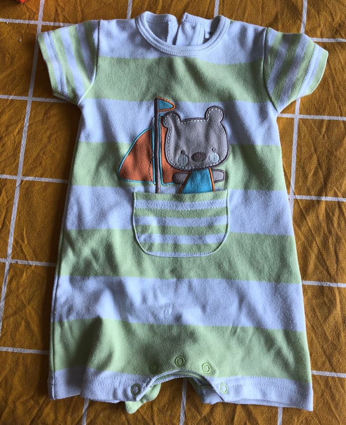Barboteuse blanche et verte en très bon état même si le tissu a un peu bouloché. Taille 6 mois.