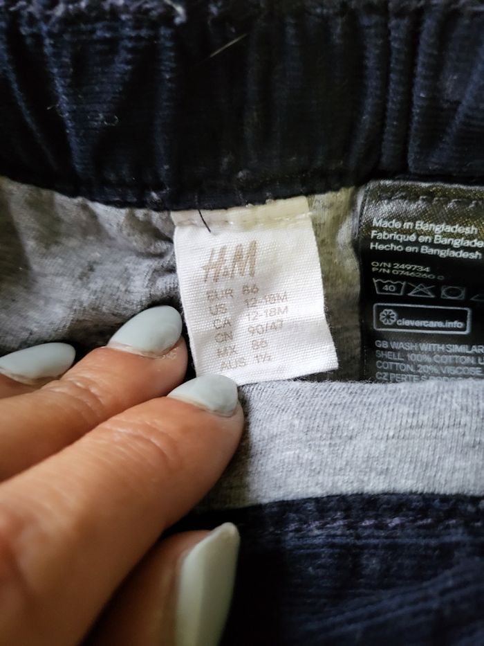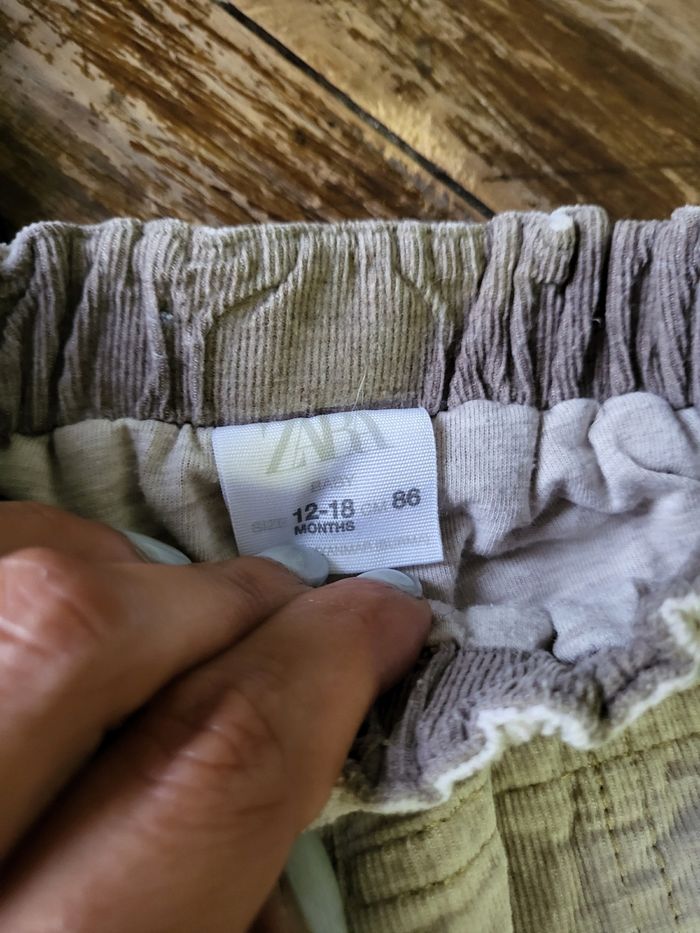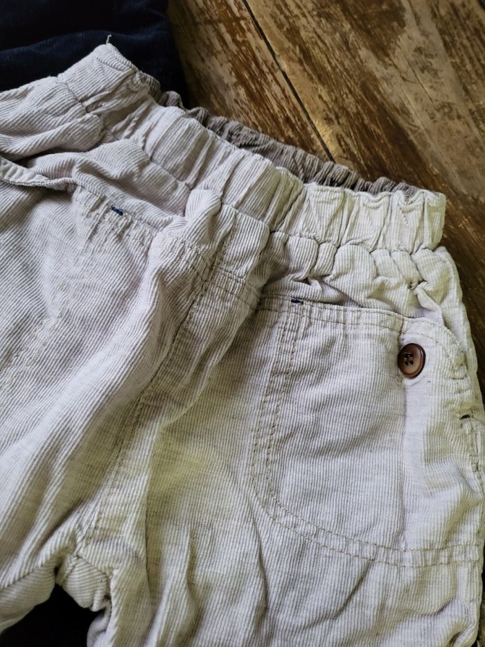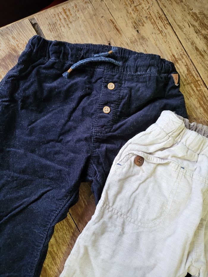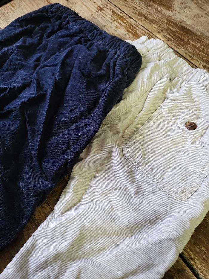 2 pantalons en velours, 1 beige zara et 1 bleu H&M taille 12/18 mois en très bon état