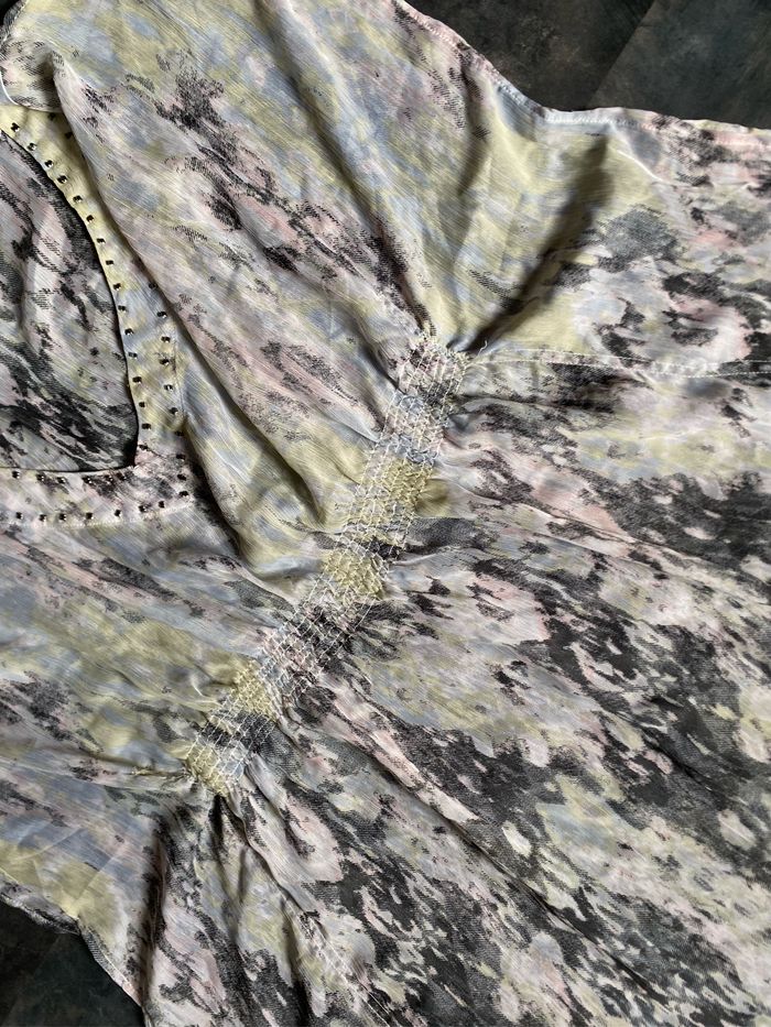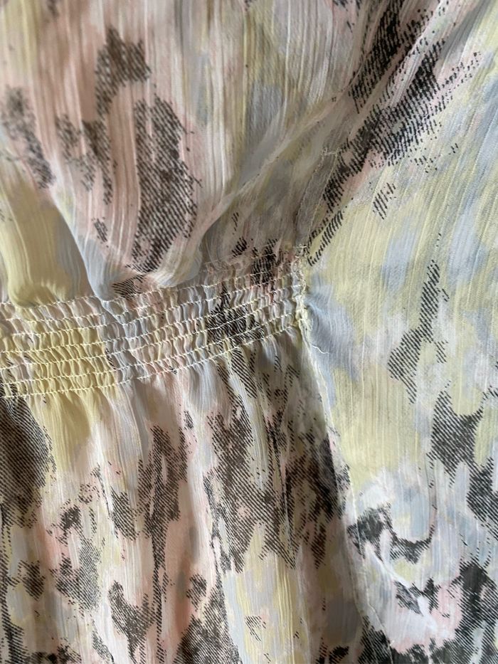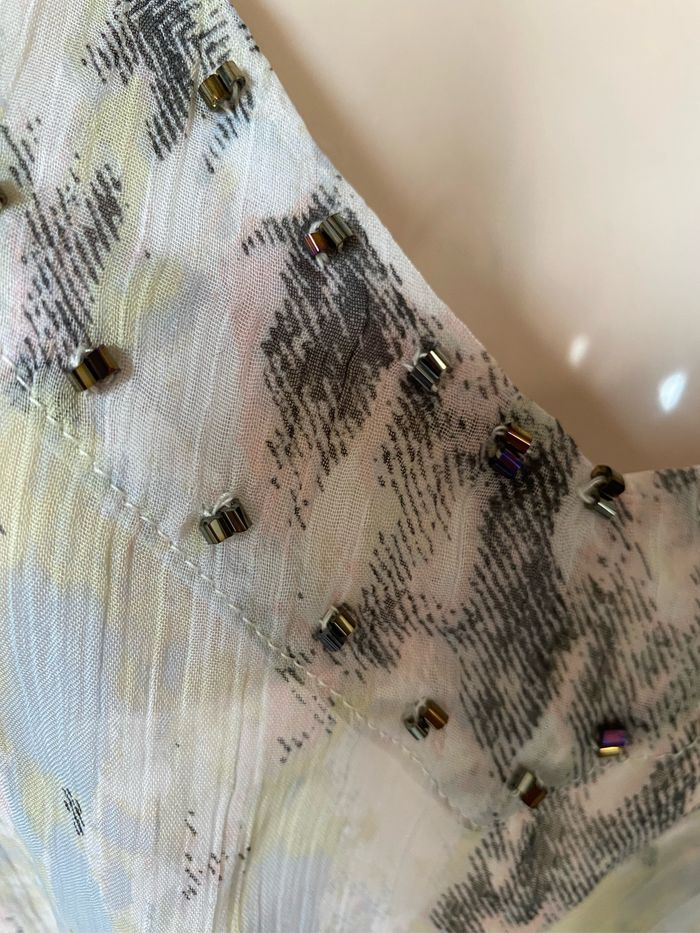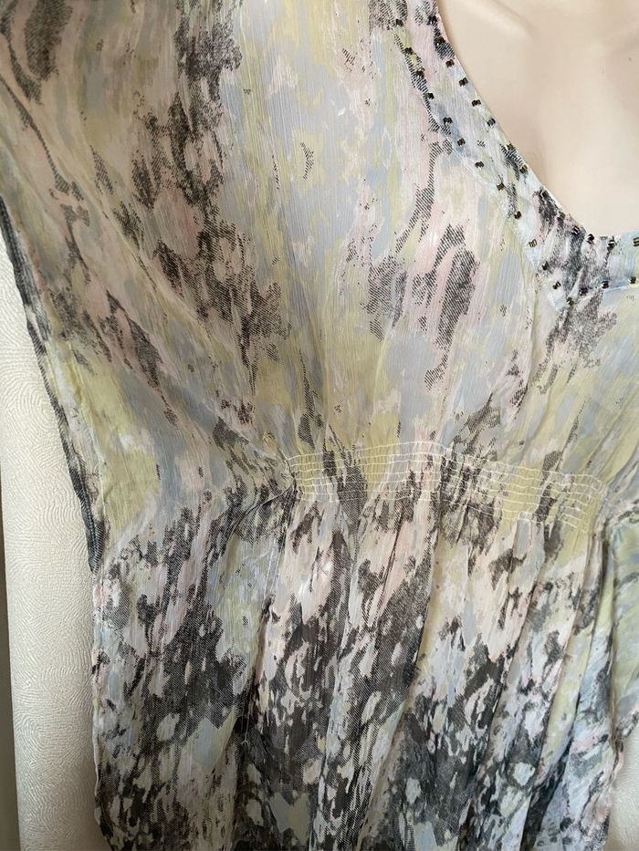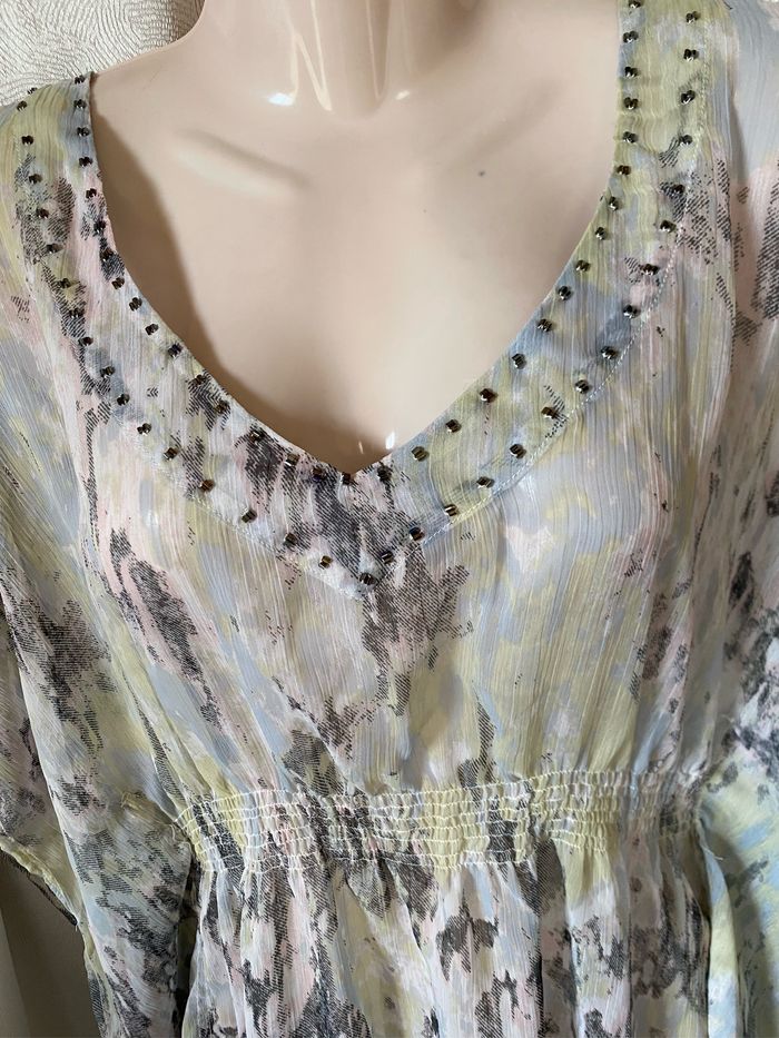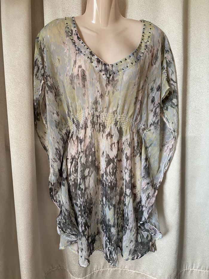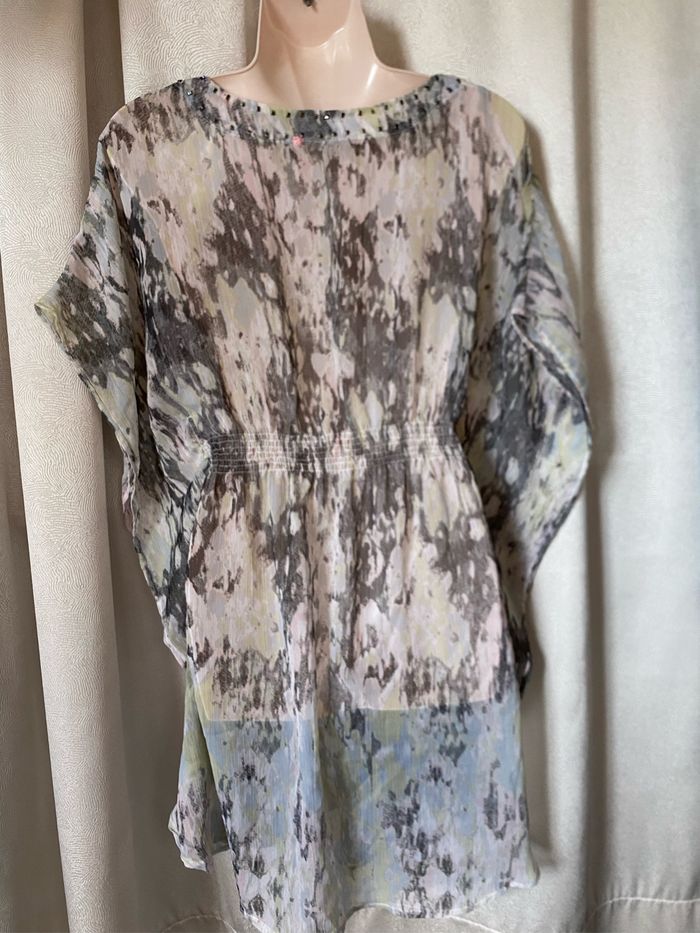 Très jolie tunique de plage forme chauve-souris Tissu transparent Tons moiré gris rose jaune Perles sur l'encolure Smocks à la ceinture taille unique mais convient maximum à un 40
