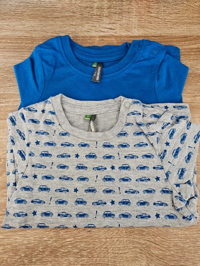 Lot 2 t-shirt légers manches longues 6 mois. 2 boutons pressions à côté du cou afin de faciliter le passage de la tête de bébé. 100% coton. Envoi rapide. État: Comme neuf.