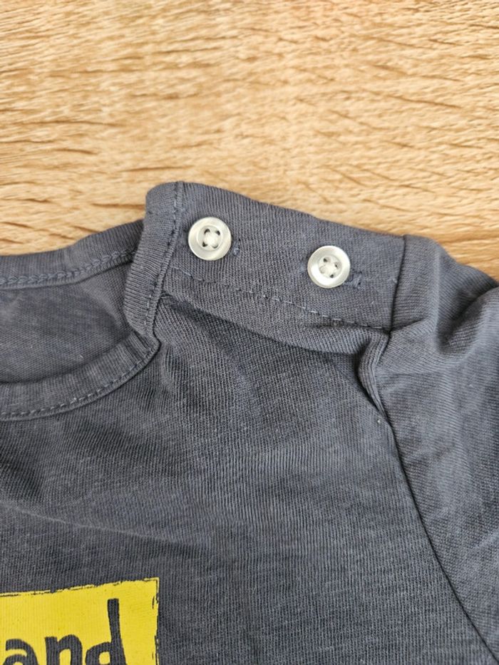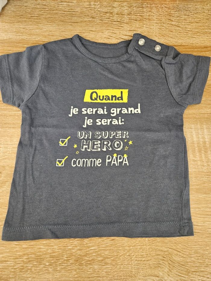 T-shirt garçon 3 mois en très bon état. 2 boutons à côté du cou afin de faciliter le passage de la tête de bébé. 100% coton. Envoi rapide.
