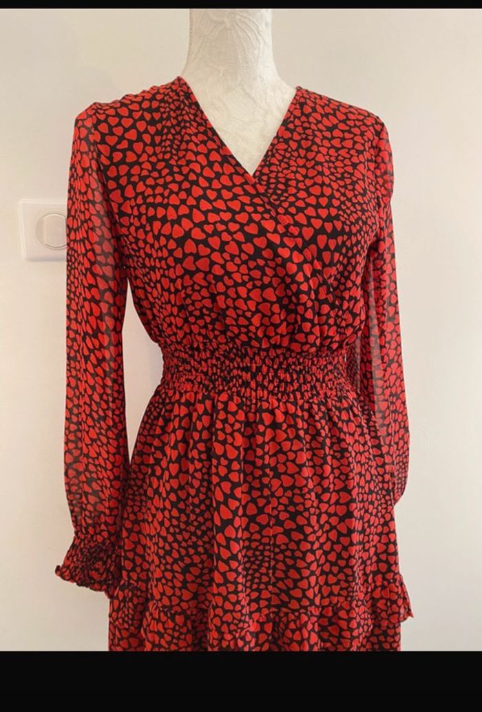 🌸Cette robe de chez Boohoo est une pièce à la fois romantique et dynamique, parfaite pour une tenue de journée affirmée ou une sortie décontractée. 📐Taille: 36 🎨Couleurs : imprimé intégral de petits cœurs rouges sur un fond noir ✅Remarque : Un peu filet au niveau du sein voir photo 5 (pas trop voyant)