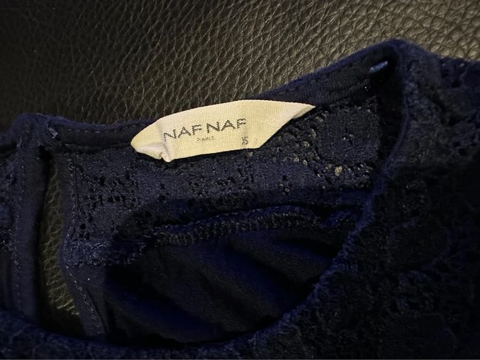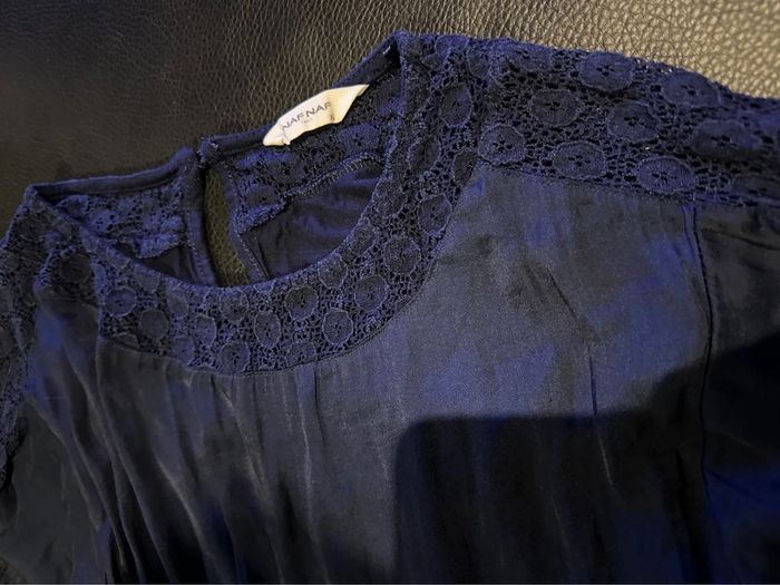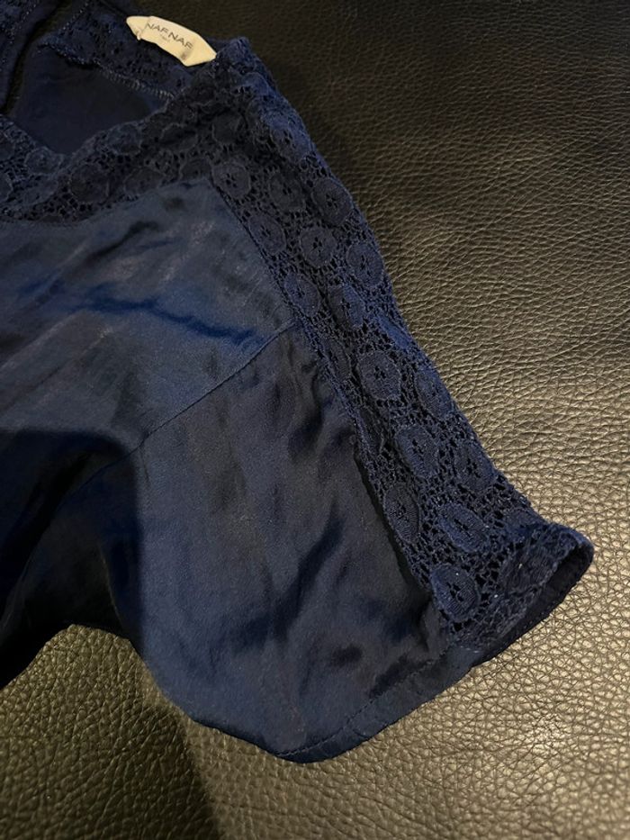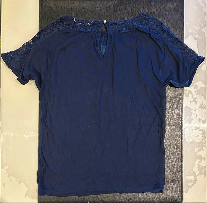 Très joli haut bleu marine bi matière (satinée devant et coton derrière) avec dentelle sur le col et les manches. En très bon état (étiquette intérieur découpée) Envoi rapide et soigné ☺️