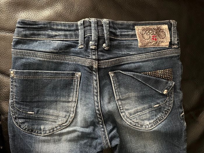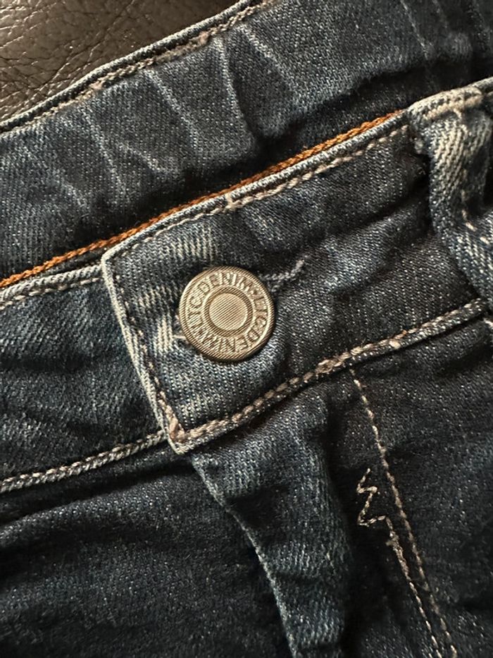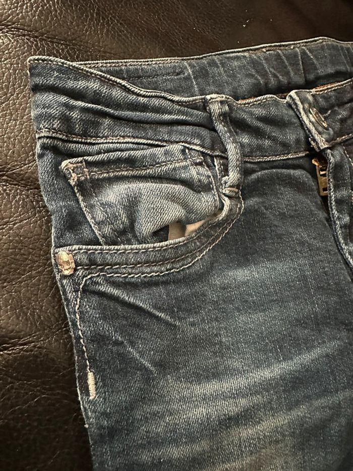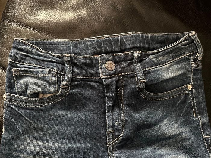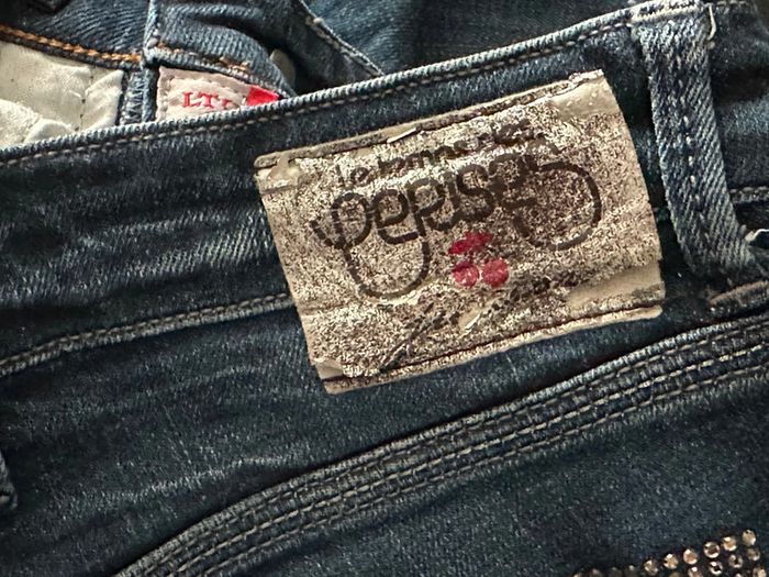 Jean en parfait état excepté l’étiquette à l’arrière du jean qui se décompose elle finira par partir mais cela n’enlève rien à ce superbe jean avec strass sur les poches arrières et mini têtes de mort 🤩 Envoi rapide et soigné ☺️