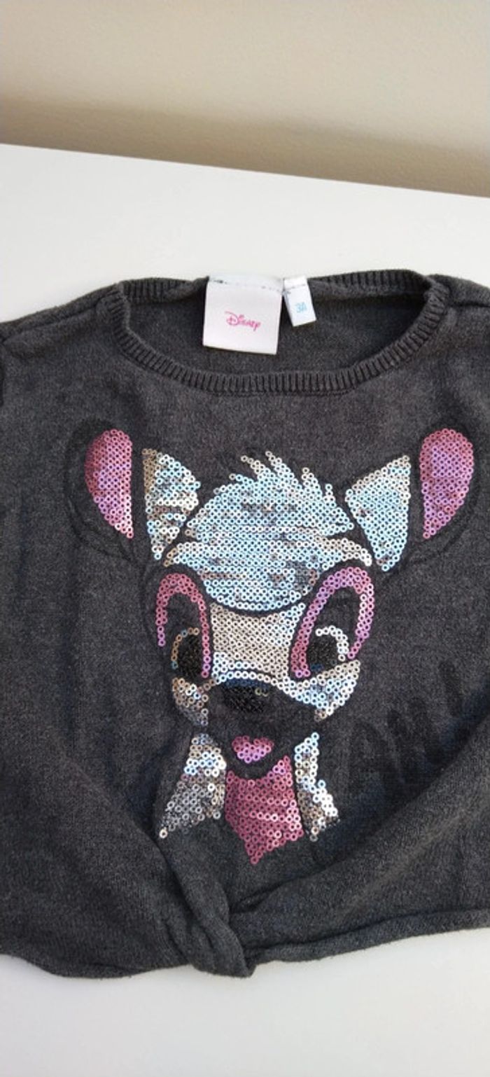 Je vends ce pull de couleur gris foncé avec l'effigie de Bambi en sequins sur le devant, de la marque Disney et en taille 3 ans. Le bas du pull fait une sorte de noeud. #Estelle2150_enfant_3ans