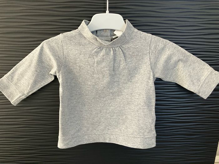 Pull gris à col cheminée, avec 4 boutons pression derrière, 100% coton, de marque Vertbaudet, taille 3 mois Très bon état
