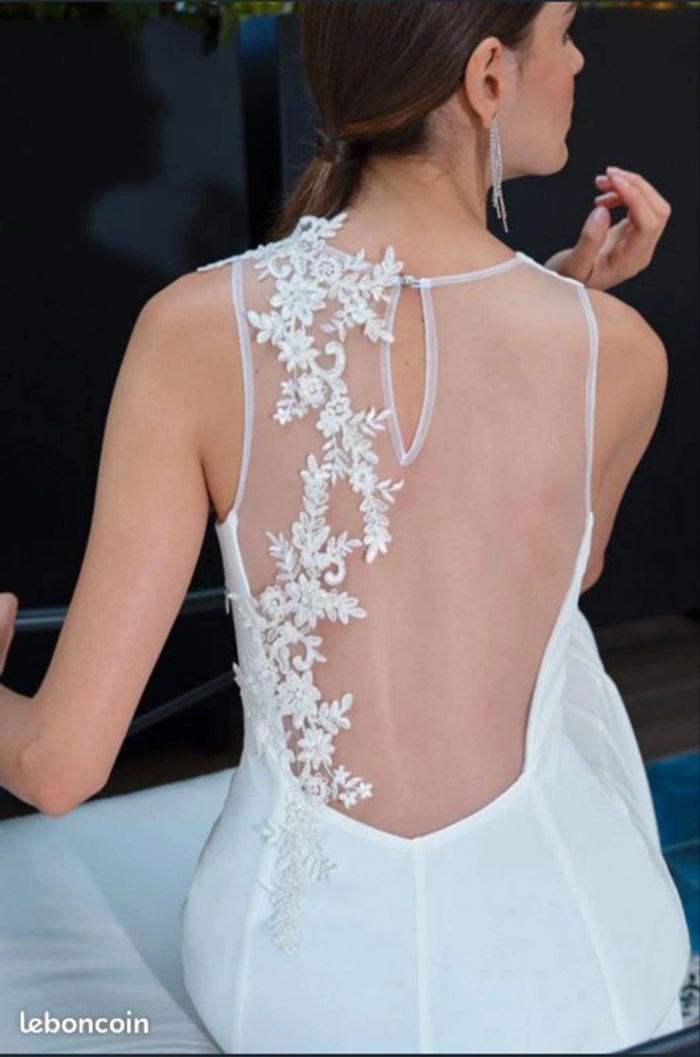 Superbe robe de mariage / mariée neuve, jamais portée et encore etiquettée. Taille 44. Non retouchée donc possible de la faire ajuster à votre taille et morphologie par une couturière. Achetée 1650€. Coupe sirène fluide, Superbe dentelle en transparence dans le dos, effet tatouage. Fendue devant. Marque de maison de couture espagnole (Carol Ruiz Couture - équivalence qualité Pronovias, Pronuptia ou encore Justin Alexander), collection 2024. Pas d'envoi possible (trop peur qu'elle abîmée, perdue ou de me faire arnaquer je suis désolée). A voir sur Béziers