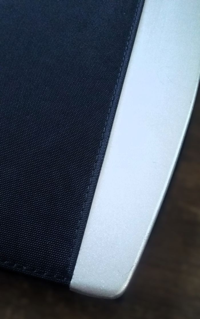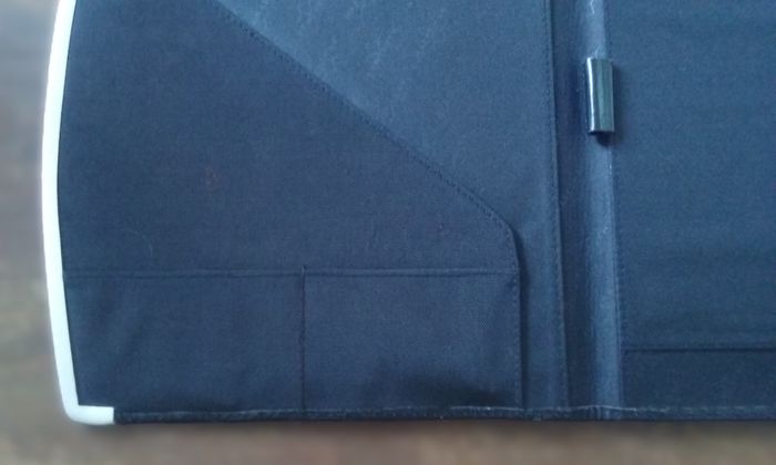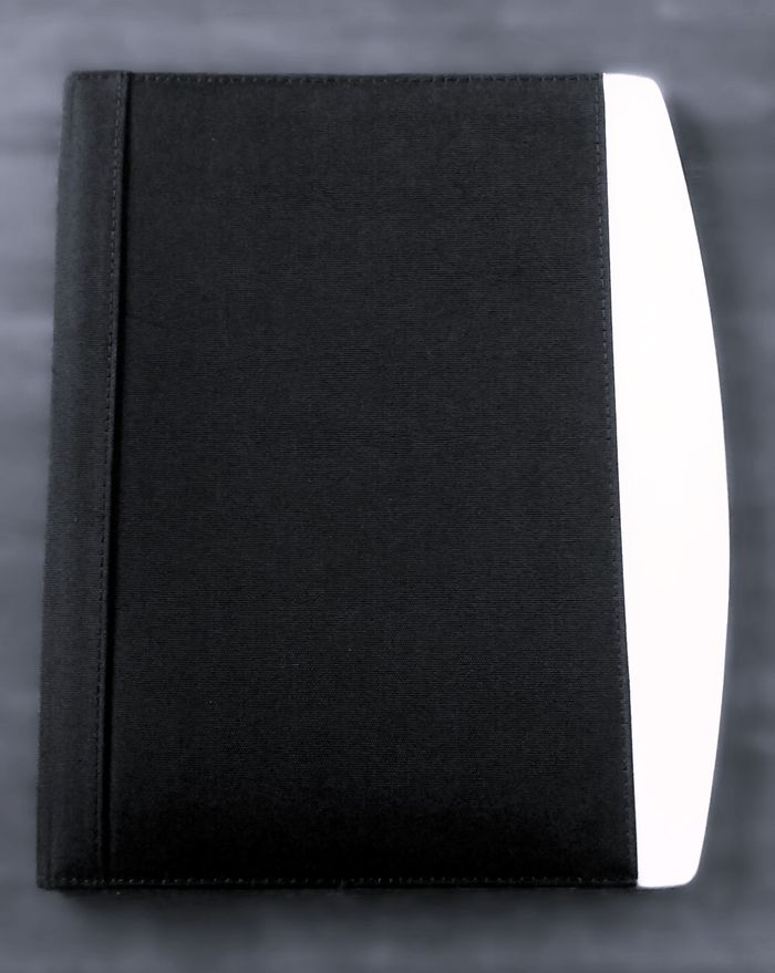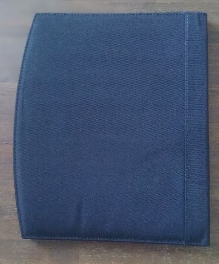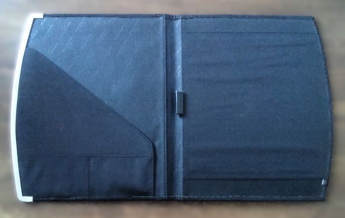 Ce conférencier est composé d'un soufflet porte-documents et de compartiments porte-cartes, d'un emplacement pour fixer votre bloc note A4, d'un support pour le stylo, en carton rigide recouvert de tissu épais et bord en alu, coloris noir, 32 cm x 27cm.