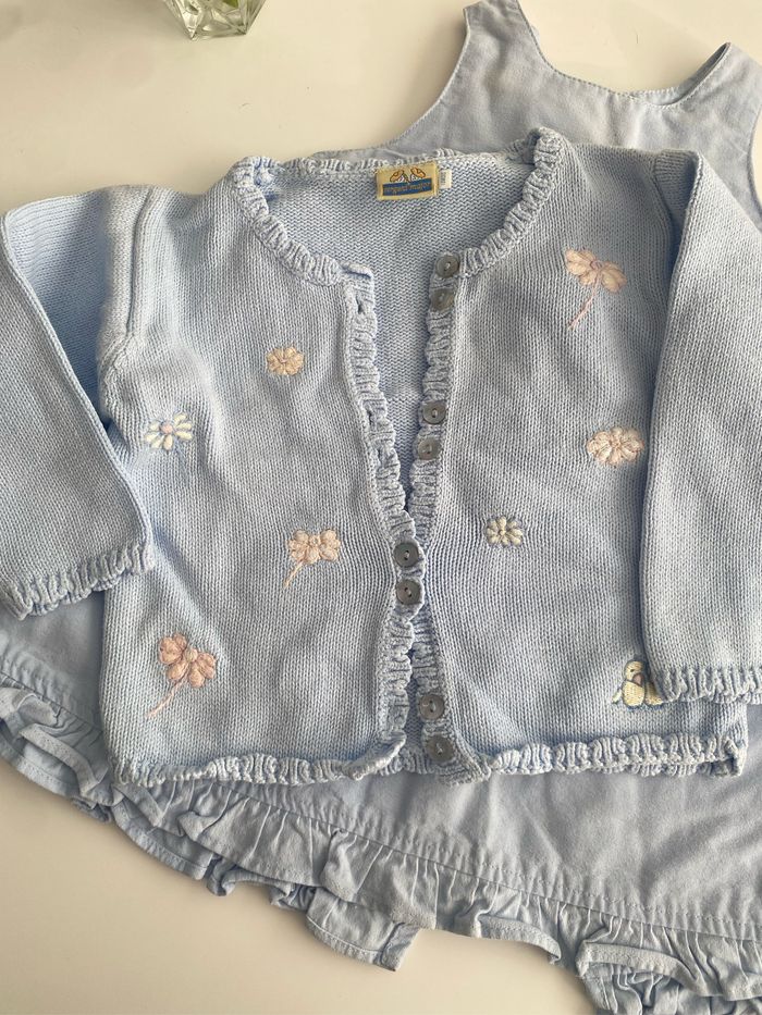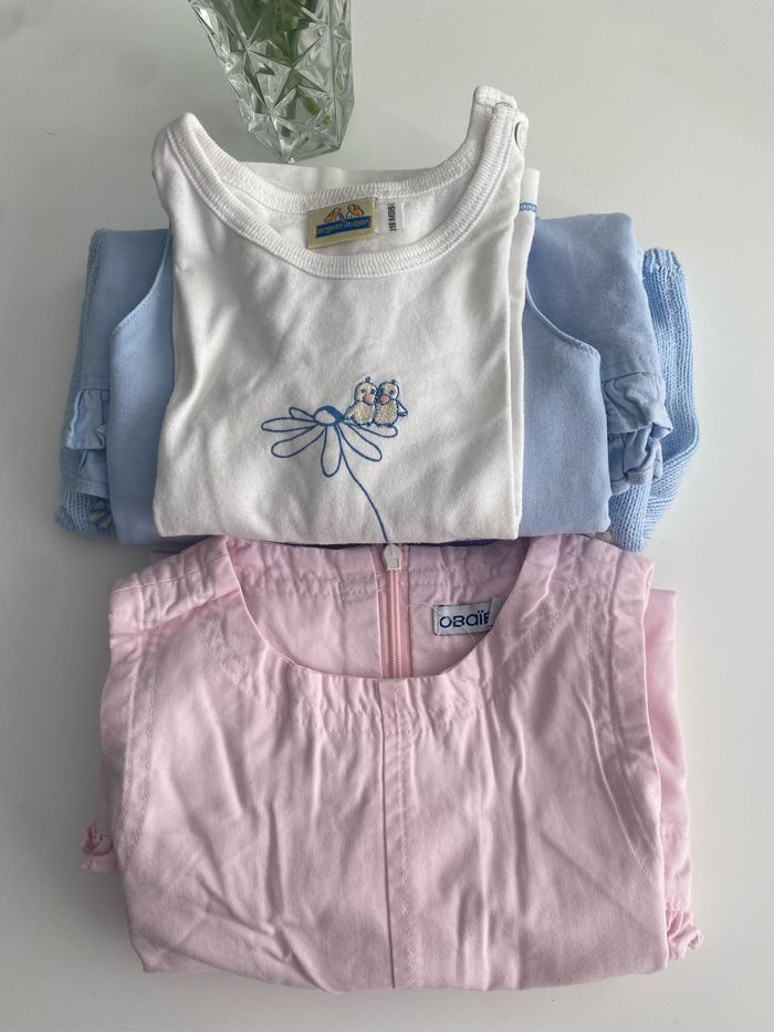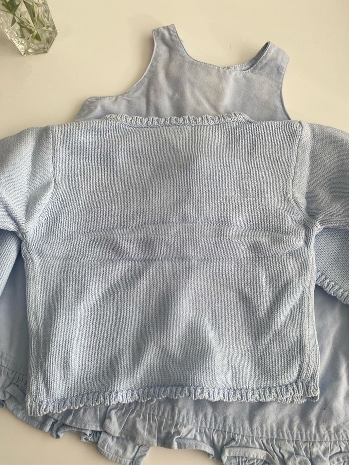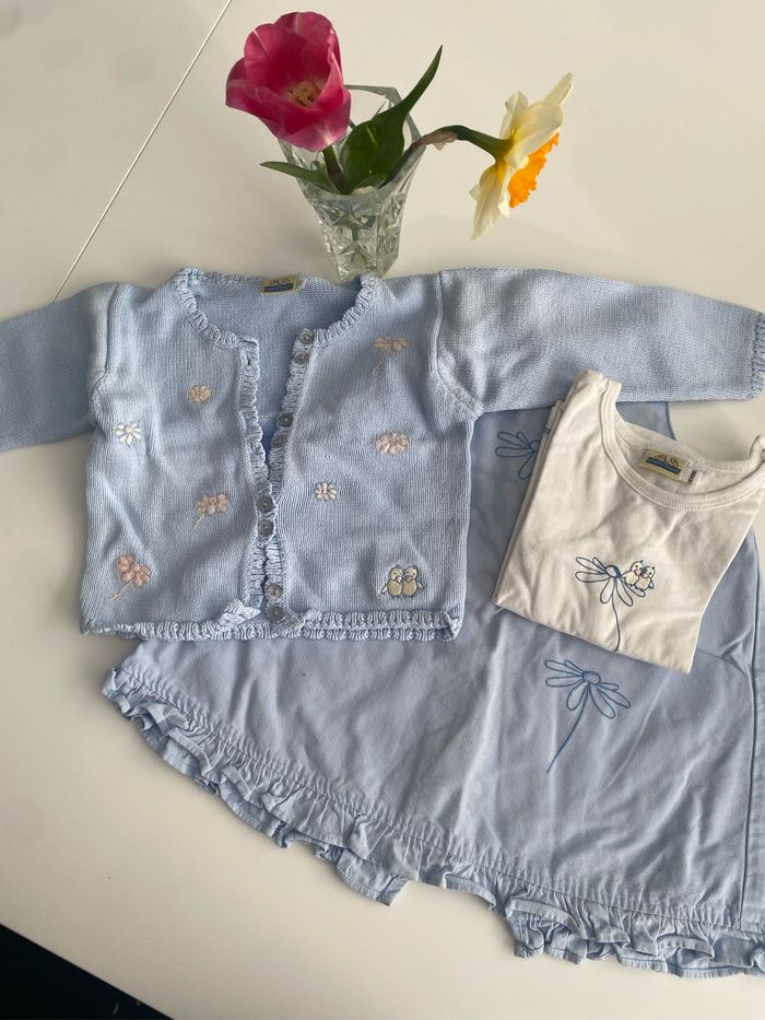 Un magnifique ensemble 3 pièces de chez Sergent Major porté qu’une fois ( juste le haut et la robe , le gilet est neuf ) et une robe toute neuve Okaïdi . 18 mois . 100% coton . Un petit défaut sur le haut de la robe bleue qui a un peu jauni lors du stockage . 30€