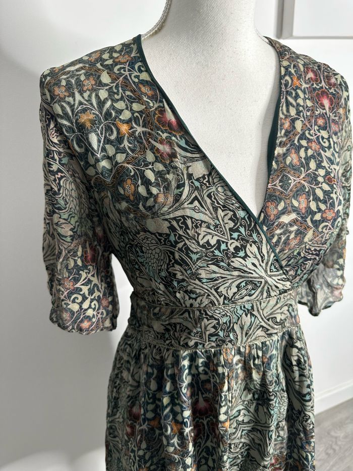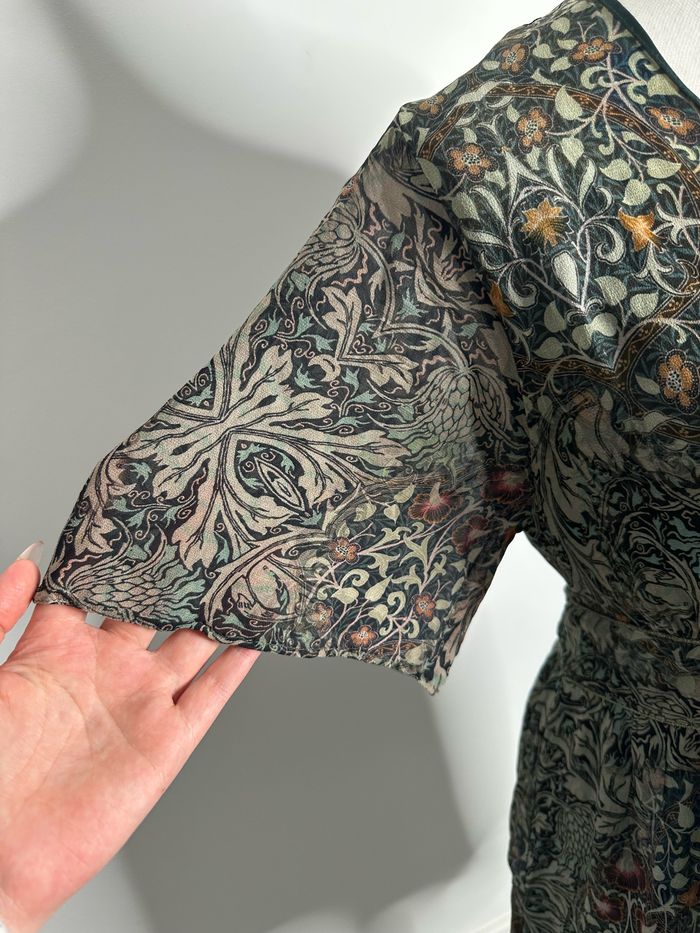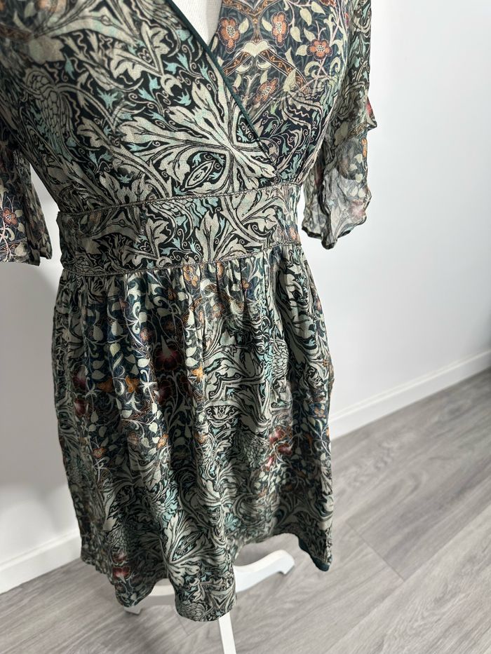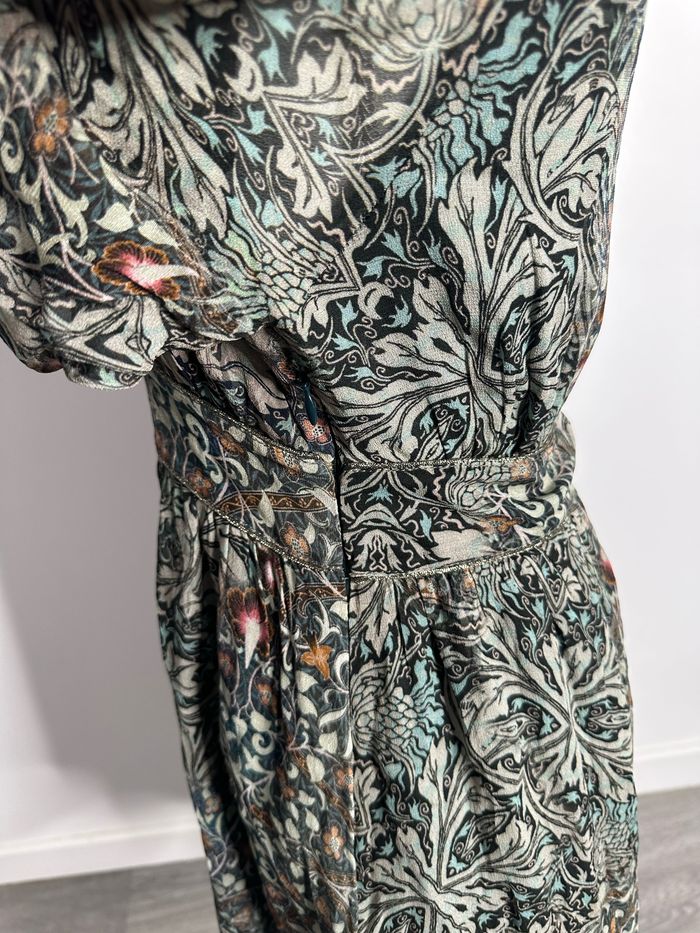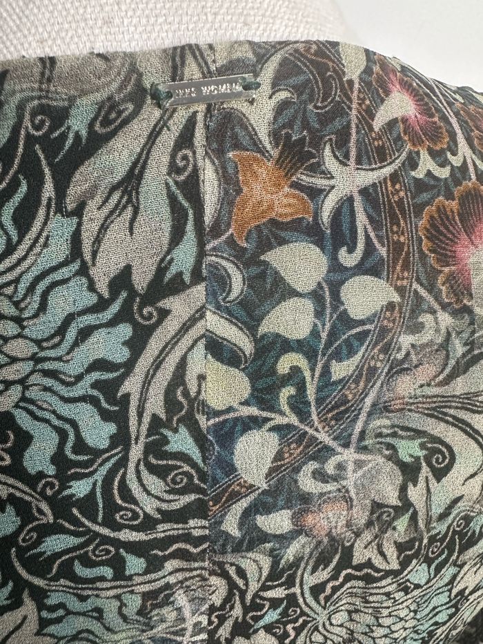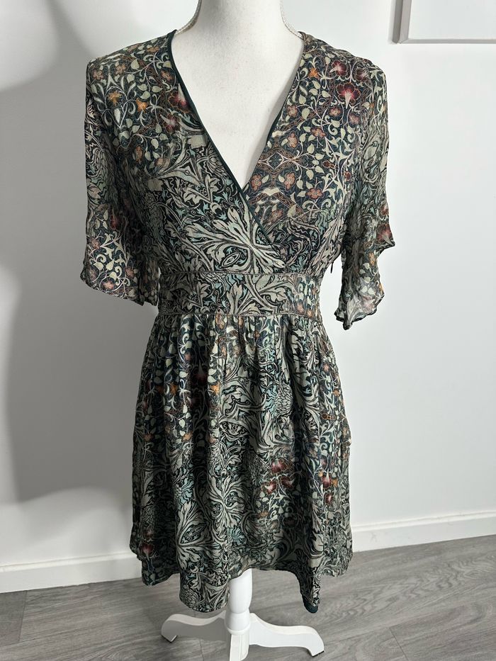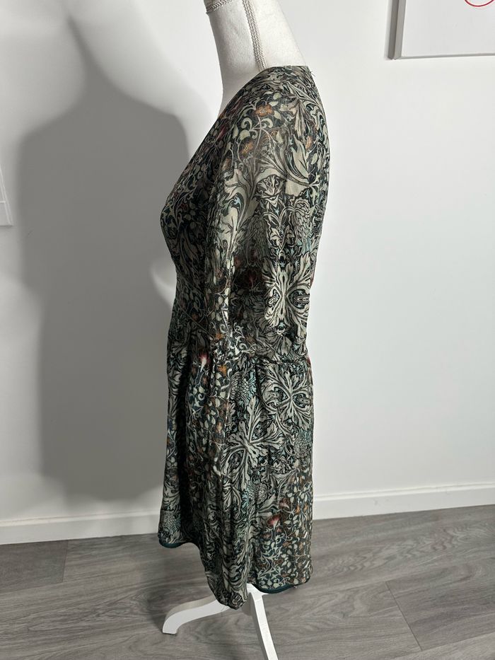 Robe - Excellent état - Taille 36 équivalent S - Marque IKKS - Imprimés fleurs - Zip sur le côté - Kaki et multicolore - Col drapé - Manches transparentes - Doublure intérieure - Polyester et viscose - Prix d’achat: 225€ Dimensions: - 44cm niveau aisselles - 88cm de long