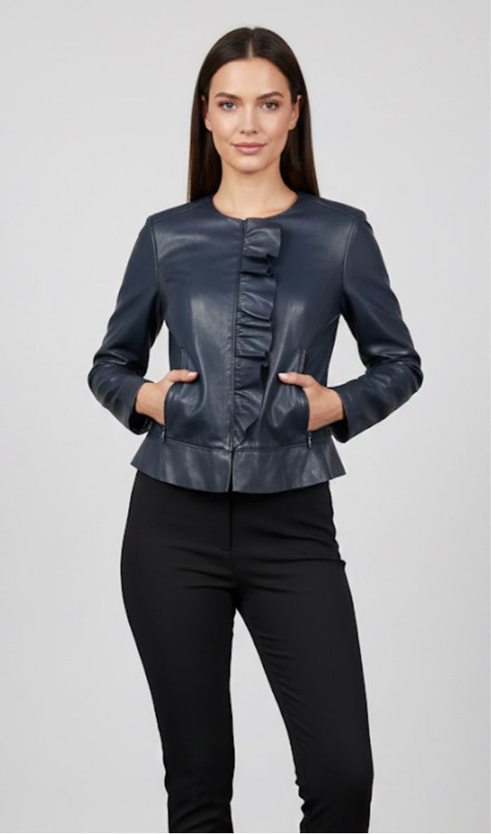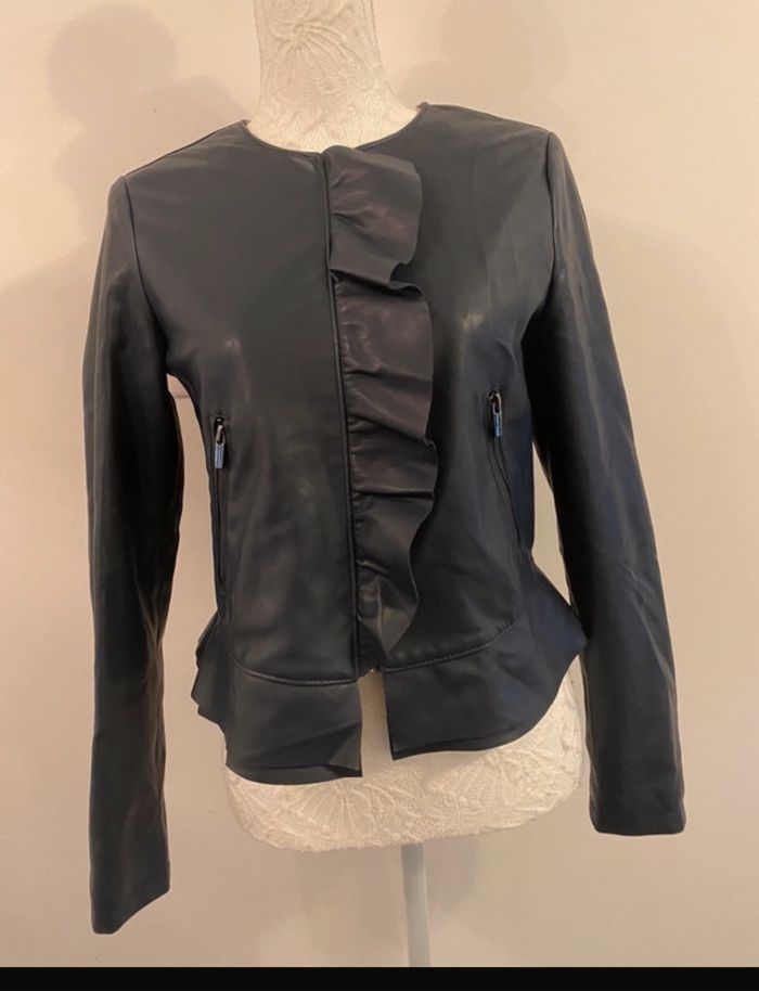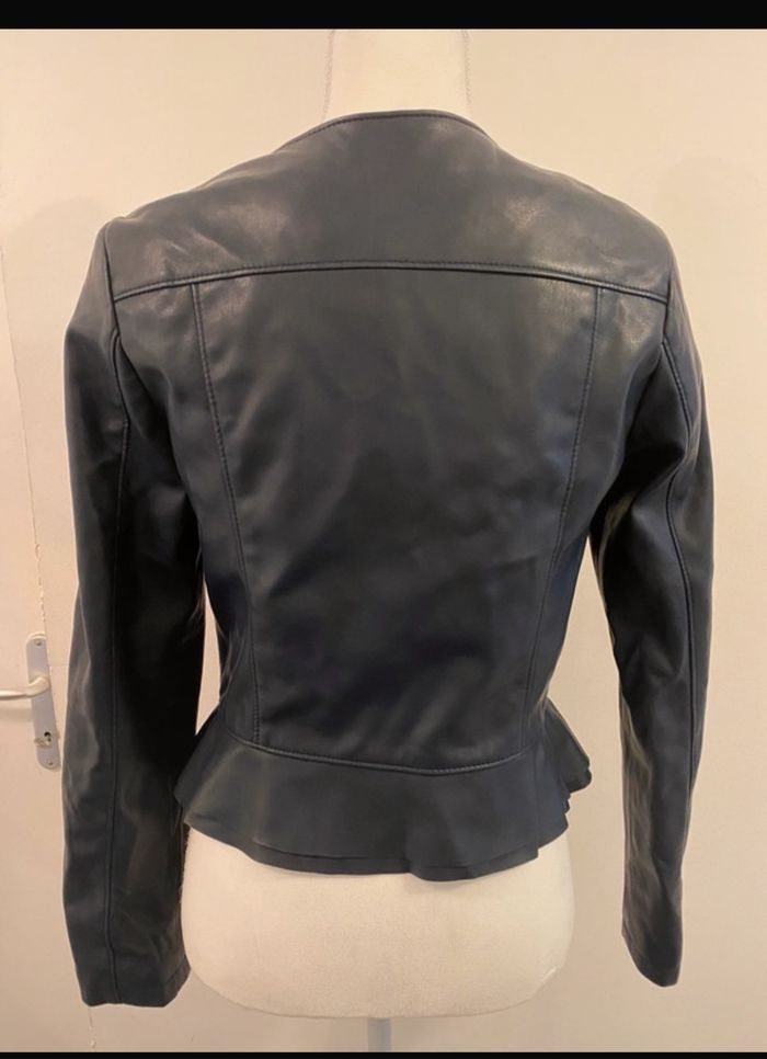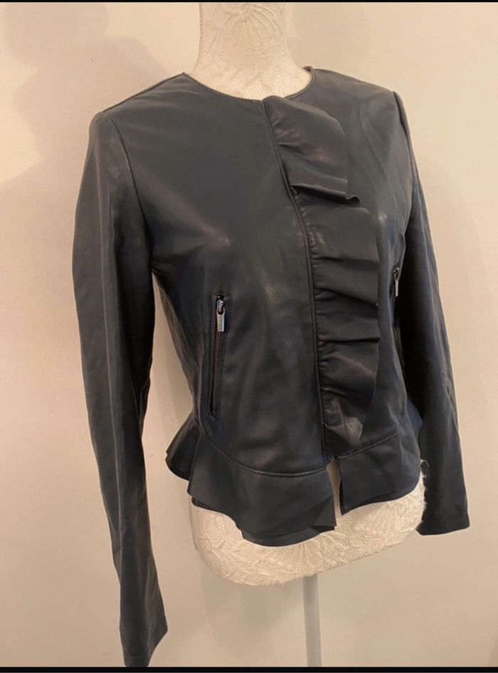 Veste femme de marque Zara, au style chic et moderne ✨ Idéale pour un look chic, habillé ou casual. Parfaite pour la mi-saison 📐Taille : M 🎨Couleur : Bleu marine 👩🏻Coupe : Ajustée et féminine 🧵 Matière : 100% polyester, Aspect cuir (similicuir) ✅Volant décoratif sur le devant pour une touche élégante • Fermeture discrète sur le devant • Deux poches zippées pratiques