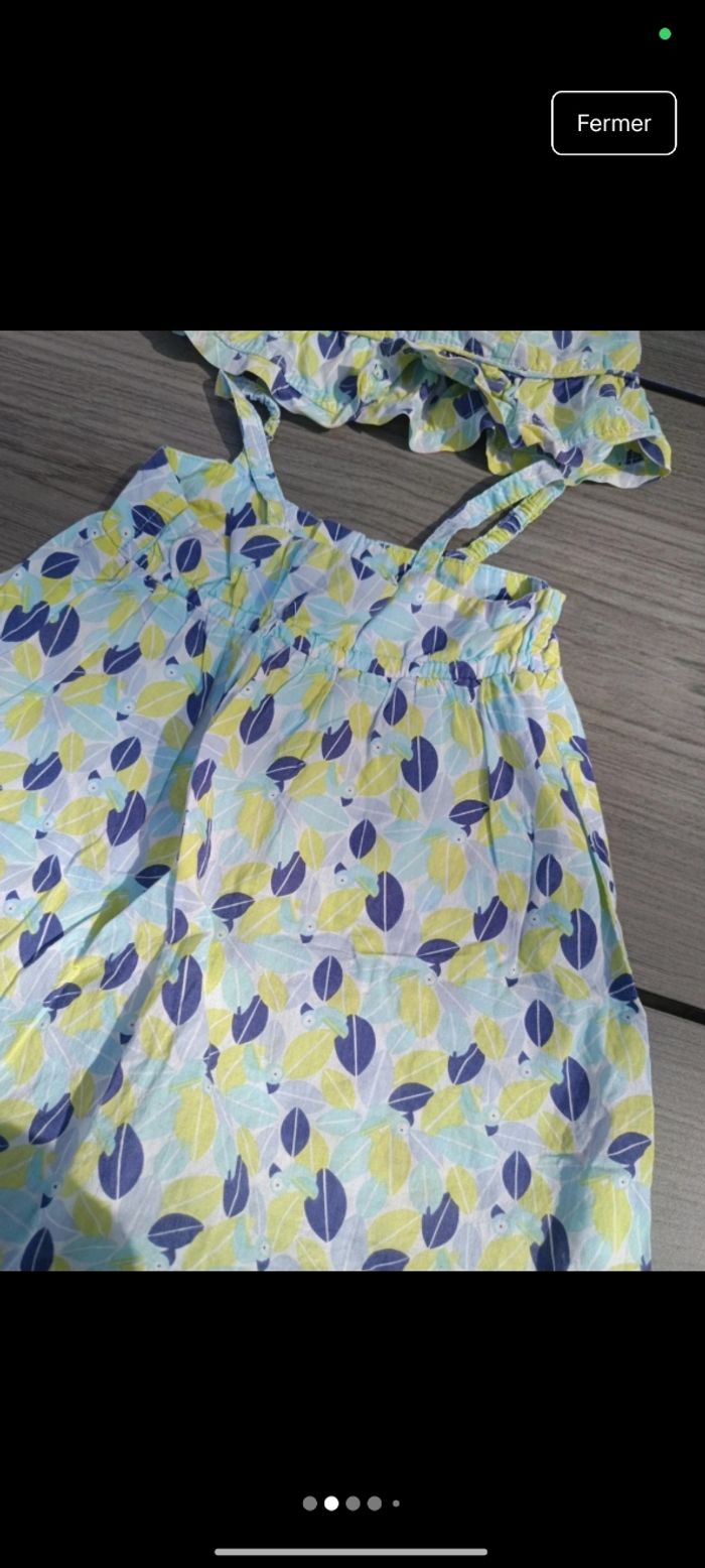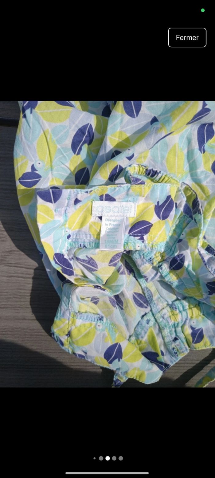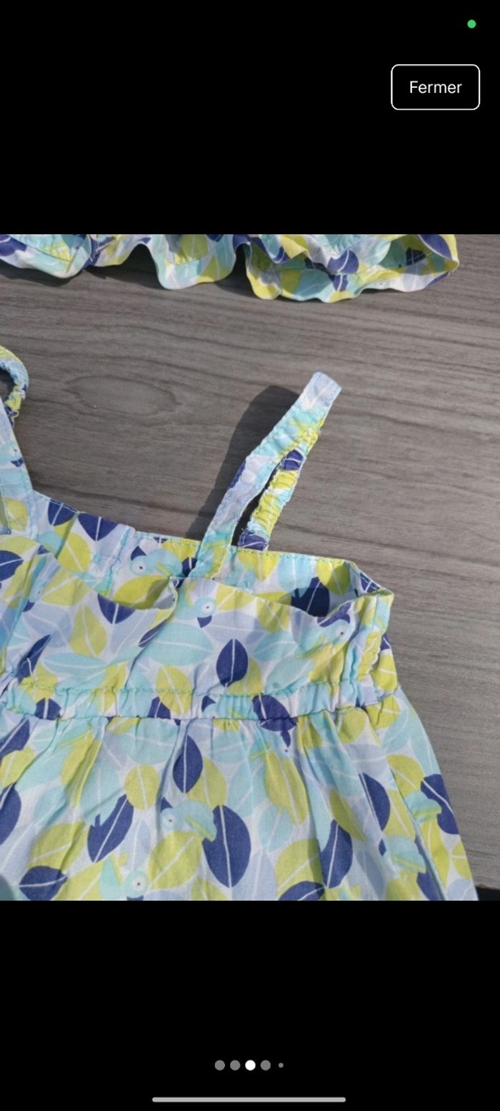 Taille : 18 mois / 81 cm Marque : Obaïbi État : Très bon état Description : Robe bretelle légère motif paon. Couleur verte/bleue. Bouton haut du dos. Chapeau assortie, 49 cm. Défaut : RAS