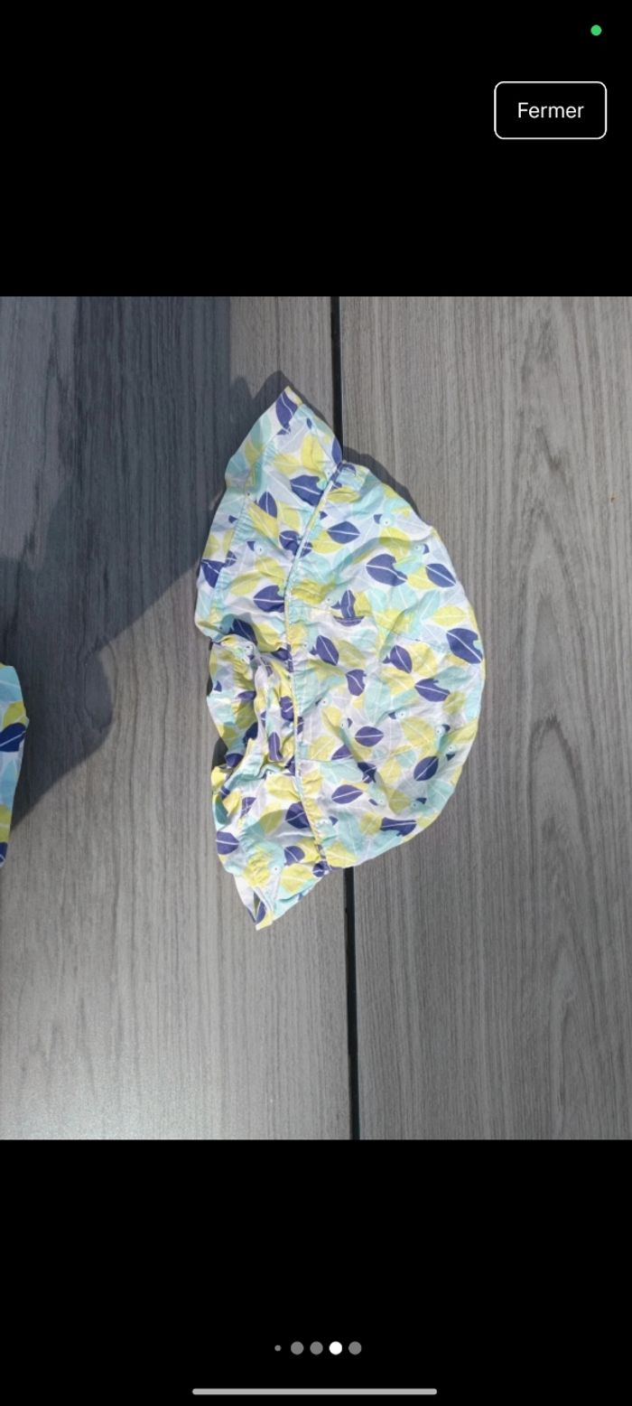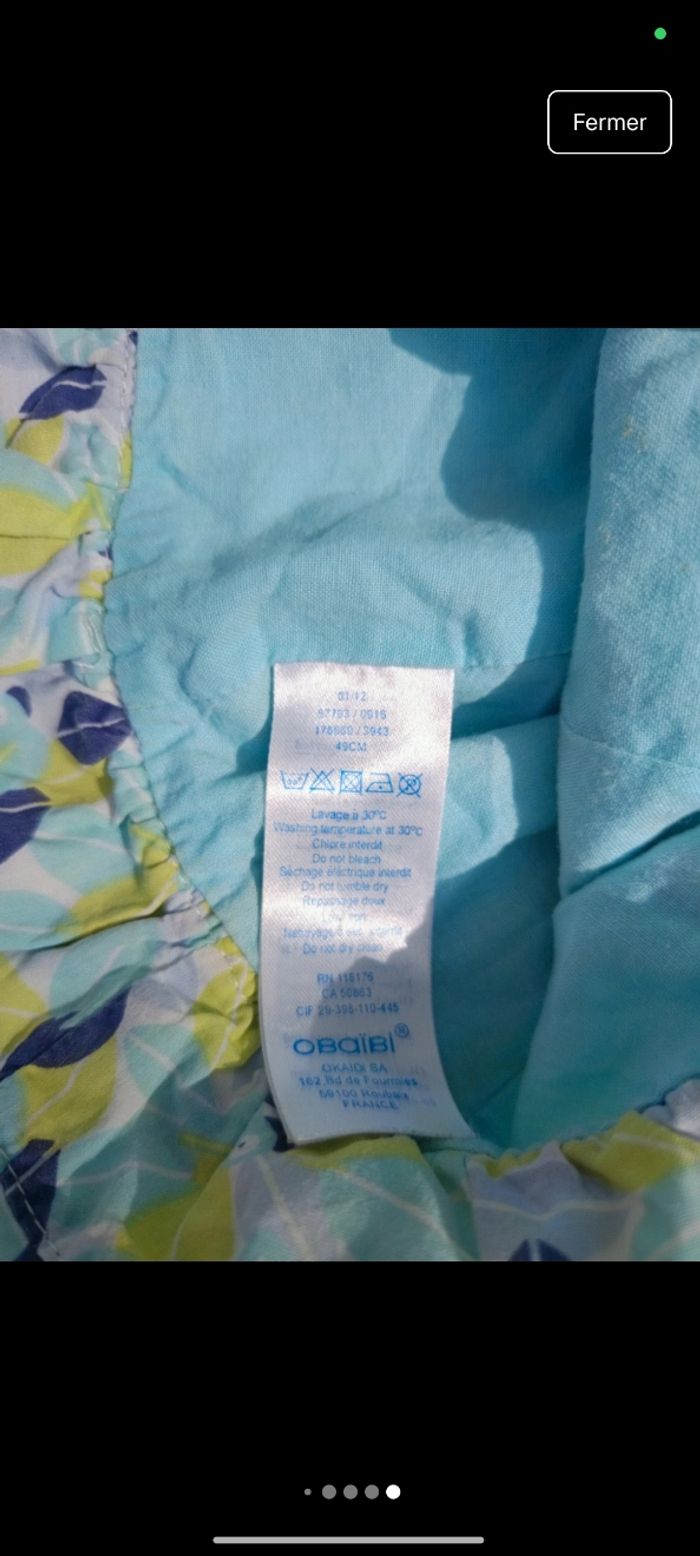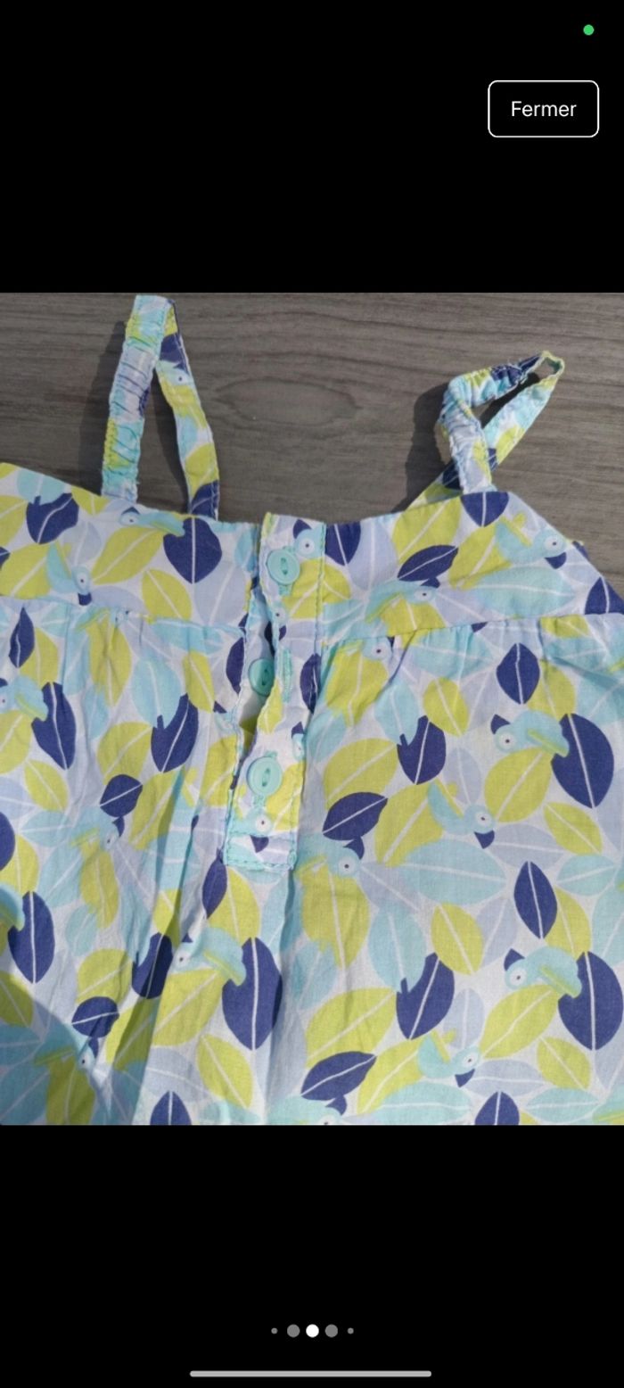 Taille : 18 mois / 81 cm Marque : Obaïbi État : Très bon état Description : Robe bretelle légère motif paon. Couleur verte/bleue. Bouton haut du dos. Chapeau assortie, 49 cm. Défaut : RAS