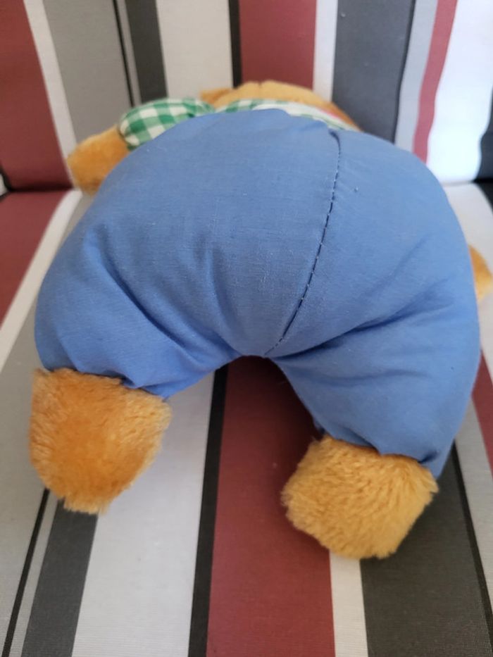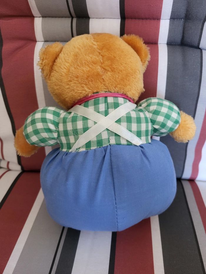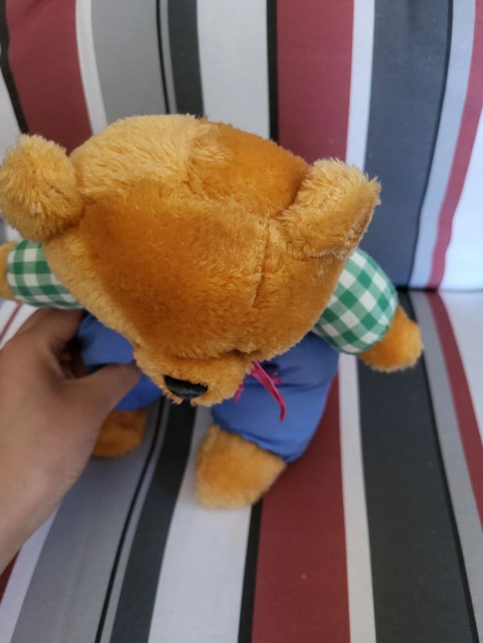 Peluche ourson en habits : salopette bleue, t-shirt vichy vert, écharpe rouge Prix de lot dès 2 peluches achetées #SILVERSYNjeux