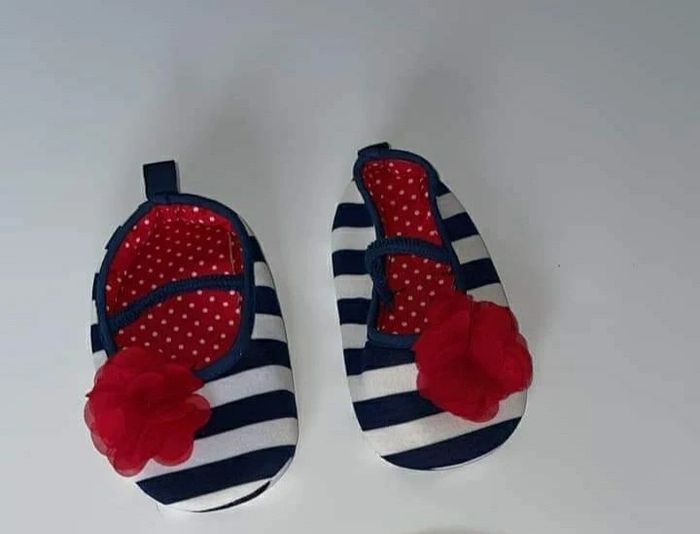 Chaussure bébé style ballerine marinière blanche et bleu foncé et sa fleur rouge Pas d'étiquette mais taille 6/12mois #ludie8635_chaussure