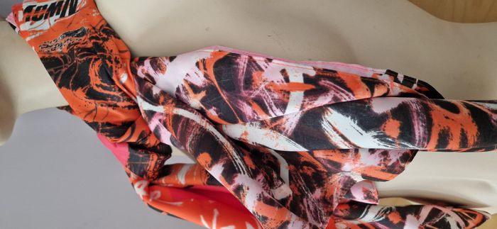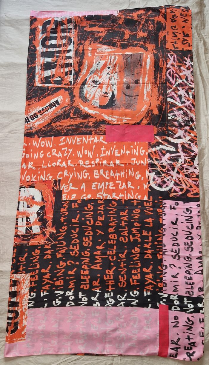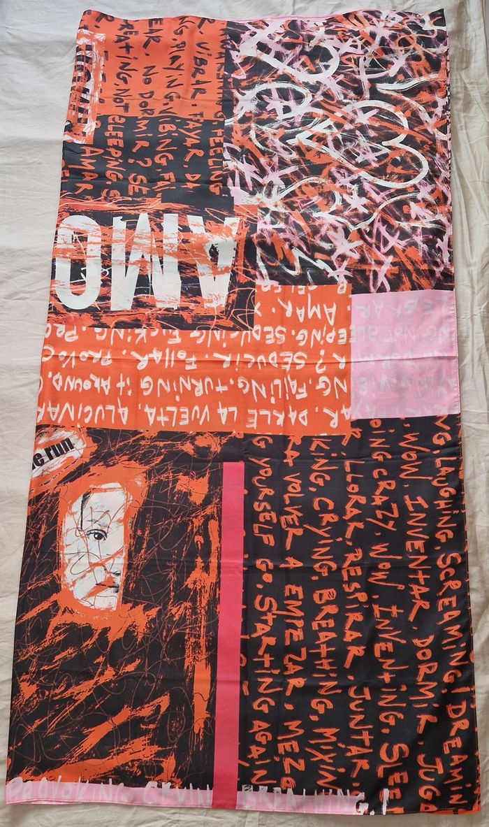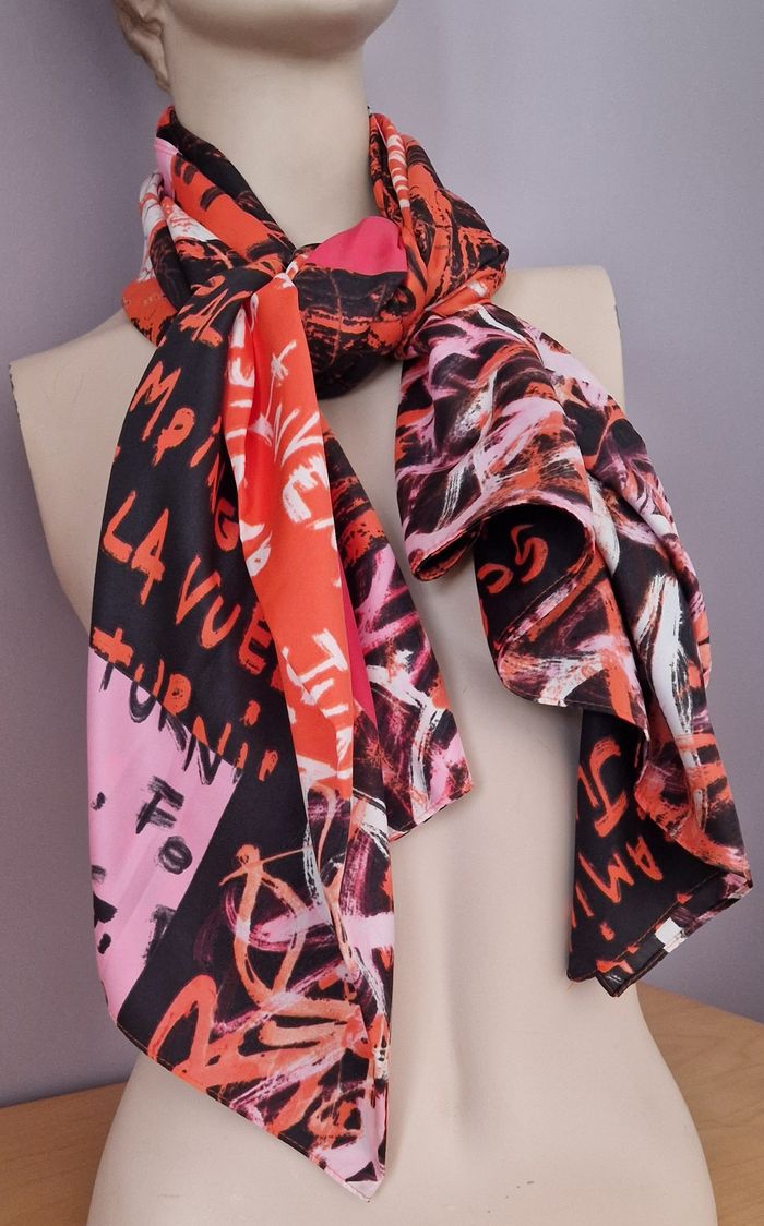 Très grand foulard carré DESIGUAL (environ 128 x 128 cm) avec imprimés géométriques et messages - Tissu 100% polyester satiné - NEUF et dans un état impeccable (vendu moitié prix).