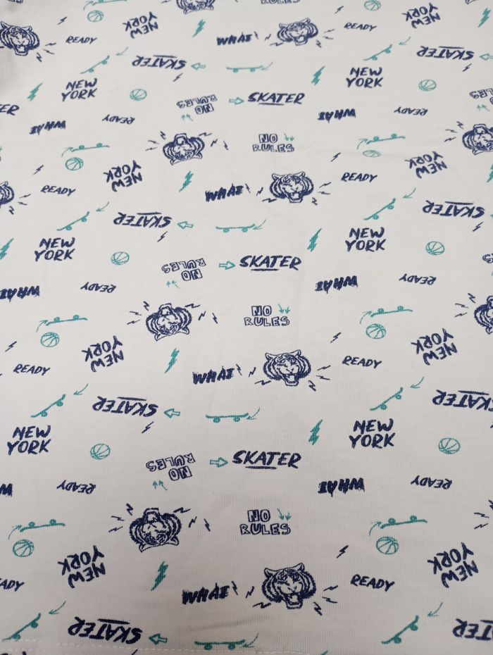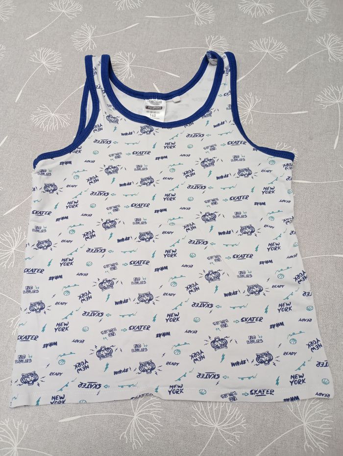 Débardeur blanc avec têtes de tigres. Taille : 140, 10 ans. Marque : Pocopiano. Très bon état. Bac 28