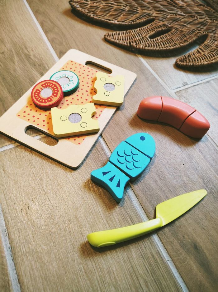 🐟Jeu d'imitation-Dinette en bois avec aliments à scratch sur plateau JB1230