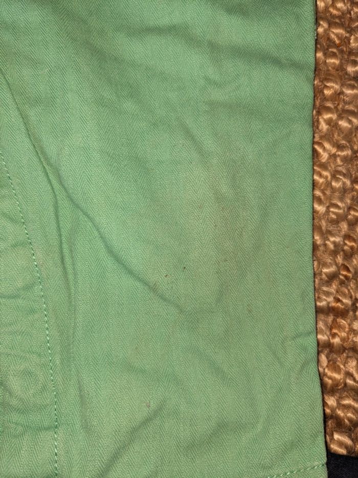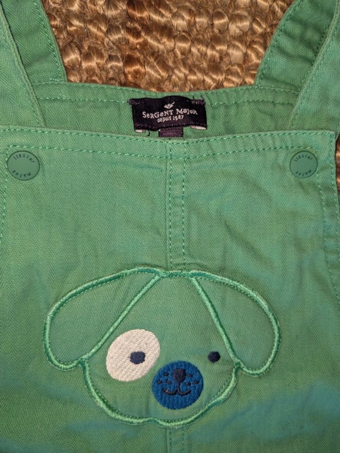 Salopette verte Sergent Major avec petit chien et mini escargot sur la poche arrière. Usée et tachée aux genoux. Sous pull col roulé marine Zara baby, bien porté aussi. #mickaelpeaullo05_bb_24mois