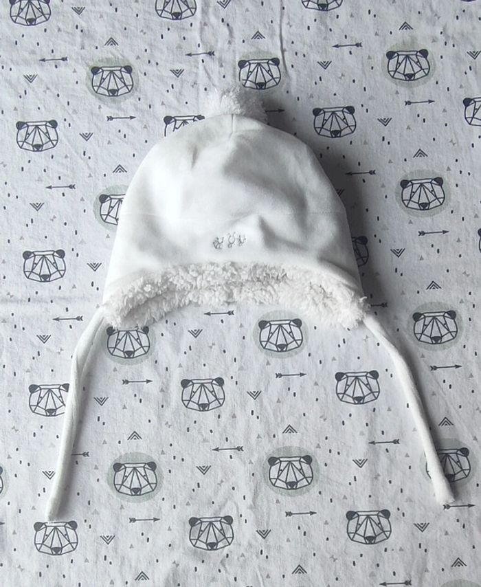 Bonnet blanc avec petit dessin sur le devant et un ponpon sur le dessus en bon état de la marque Obaïbi pour bébé taille 3 mois #neezia33240bonnetfille3mois