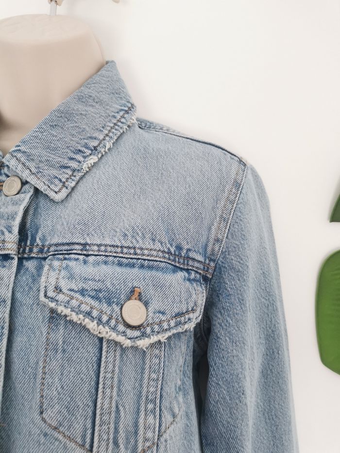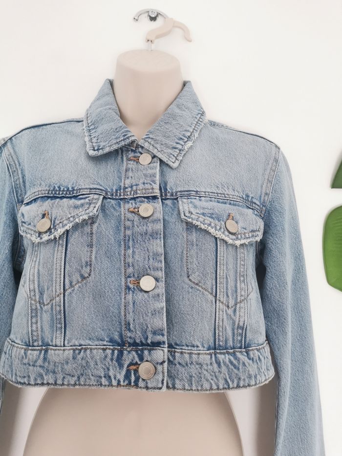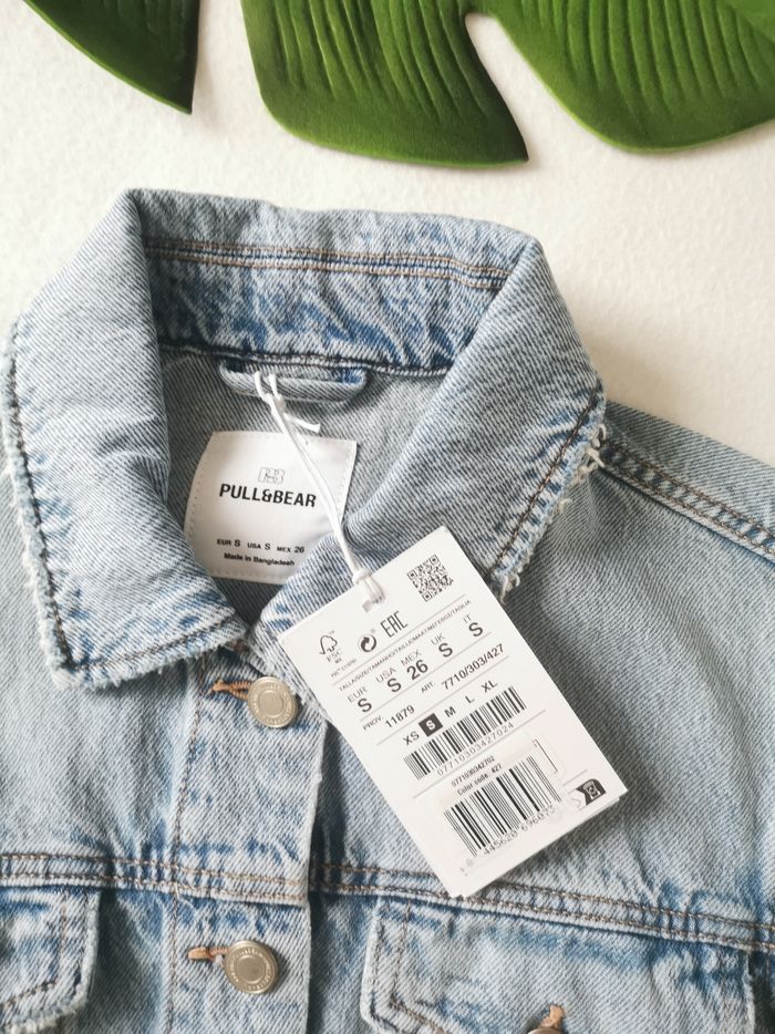 🙎‍♀️ ÉTAT DE L'ARTICLE: 10/10 ✅️ Avec étiquette🔖, jamais portée Veste en jean 🙎‍♀️ Pull & Bear Taille S • Matière: 100% coton • Coupe courte • Col à revers • Fermeture boutonnée 🔘🔘🔘 • Manches longues • 2 poches poitrine à rabat fermées par bouton 🔘 • Col et poches effet usé effiloché • Couleur: Bleu 🔵 clair • 📏 Mesure épaules: 39 cm • 📏 Mesure sous aisselles: 43 cm • 📏 Longueur: 37 cm Parfait état👌, avec étiquette🏷️, jamais porté 📎