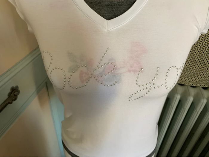 tee shirt blanc manches courtes Motif clouté "rock you" jamais porté on voit les fleurs sur le mannequin mais elles ne sont pas sur le tee shirt
