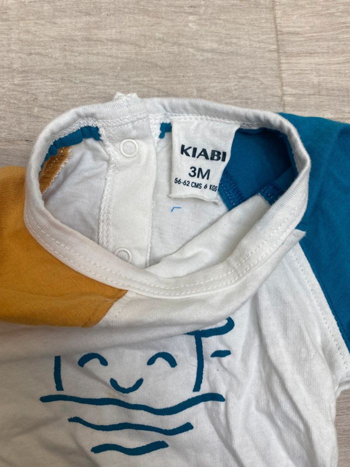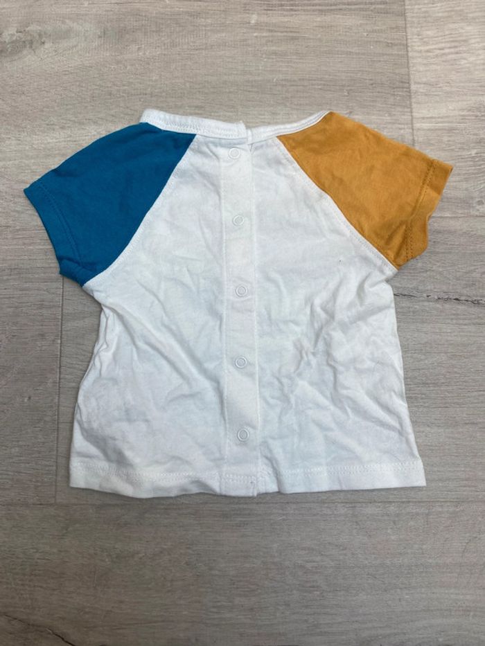 T-shirt manche courte, blanc couleurs estivales. Ouverture tout le long du dos. En très bon état, Kiabi - 3 mois (56-62cm). Dressing en 3 mois : #loll3m Remise sur lot jusqu'à -40% ! #haut #tshirt #blanc #moutarde #bleu #ete #kiabi #garçon #loll33