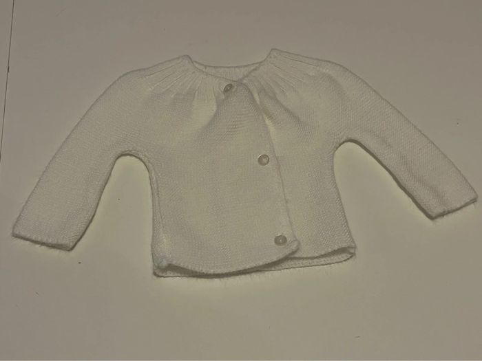 Brassière blanche en tricot en très bon état. Fermeture croisée sur le devant. Taille: Naissance C.F