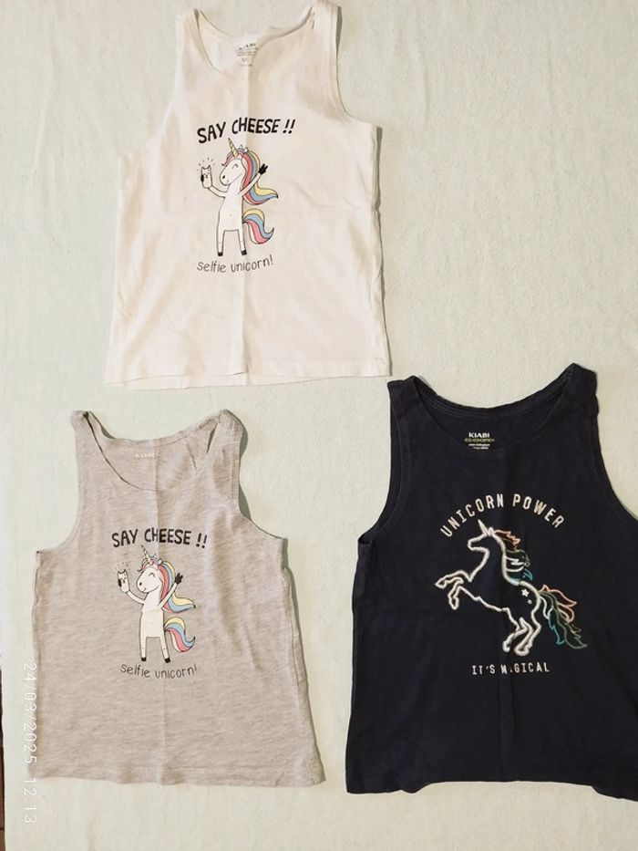 #5ansfilleceliaPinho #6ansfilleceliaPinho 🎈 Lot 3 débardeurs motif Licorne 🎈 Portés plusieurs fois 🎈 Traces d'usure visibles sur les photos (Petite tâche derrière le blanc - voir dernière photo) 🎈 En très bon état général 🎈 5/6 ans