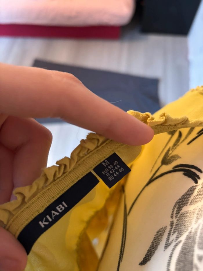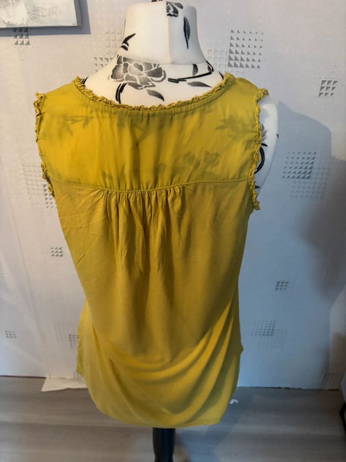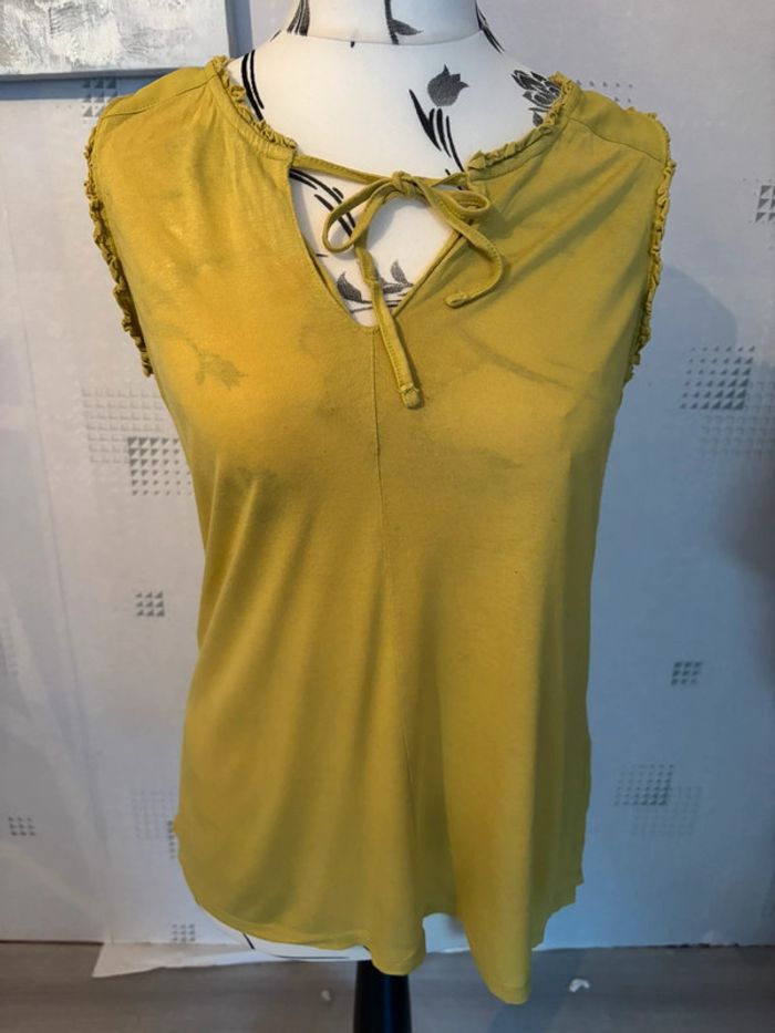 Top sans manches vert clair tire vers le jaune avec petit noeud sur le devant taille M marque kiabi très bon état