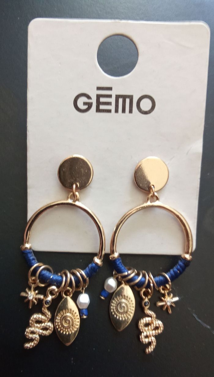 Paire de boucles d'oreilles fantaisie bleu, doré, motif marque gémi, neuves