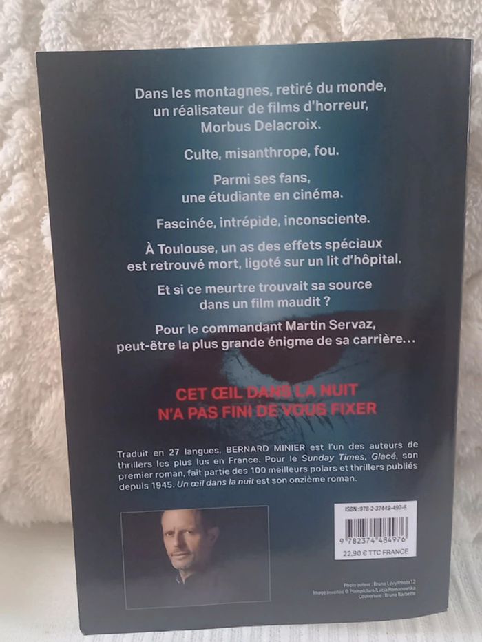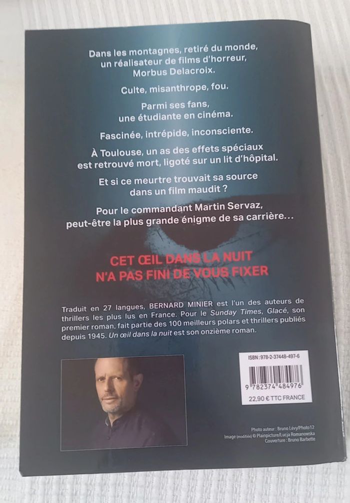 Livre en tres bon etat #livresseverinedl18 #livresadulteseverinedl18 👻un œil dans la nuit👻 Dans les montagnes, retiré du monde, un réalisateur de films d'horreur, Morbus👻un œil dans la nuit👻 Delacroix. Culte, misanthrope, fou. Parmi ses fans, une étudiante en cinéma. Fascinée, intrépide, inconsciente. À Toulouse, un as des effets spéciaux est retrouvé mort, ligoté sur un lit d'hôpital. Et si ce meurtre trouvait sa source dans un film maudit ? Pour le commandant Martin Servaz, peut-être la plus grande énigme de sa carrière... ‎978-2374484976
