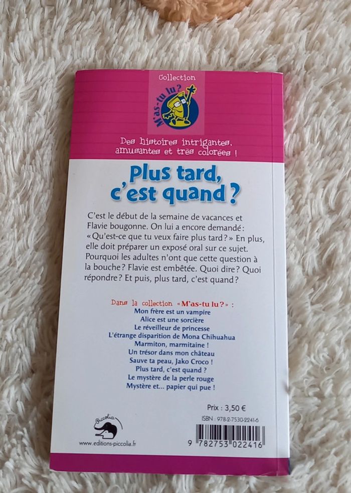 👻livre plus tard c est quand?👻 Livre plus tard c est quand en parfait etat #livresenfantseverinedl18 #livresseverinedl18 Broché ‎63 pages C'est le début de la semaine de vacances et Flavie bougonne. On lui a encore demandé: "Qu'est-ce que tu veux faire plus tard ?" En plus, elle doit préparer un exposé oral sur ce sujet. Pourquoi les adultes n'ont que cette question à la bouche ? Flavie est embêtée. Quoi dire ? Quoi répondre ? Et puis, plus tard, c'est quand ? 9782753022416